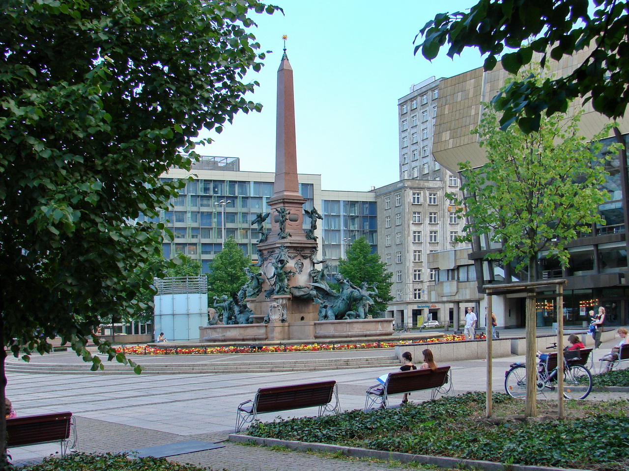 | Augustusplatz, Nordostseite (von rechts nach links): das Neue Postgebäude (nach Umbau 1884) Grimmaischer Steinweg 1, nach der Poststraße das ,,Hotel Königshof“ mit der Dachreklame ,,Weinbrand Dujardin“ Georgiring 1, anschließende Wohn- und Geschäftshäuser Georgiring, links an der Nordseite des Platzes das Neue Theater, 18641868 von Carl Ferdinand Langhans gebaut Augustusplatz Nr.3. Augustusplatz Nr. 7, davor der neobarocke Mendebrunnen (1883) und rechts das zwischen 1880 und 1886 errichtete Bildermuseum (Hugo Licht) Augustusplatz Nr.6. | Augustusplatz heute: diese Platzseite wurde nach den Zertörungen im 2. Weltkrieg völlig neu bebaut.