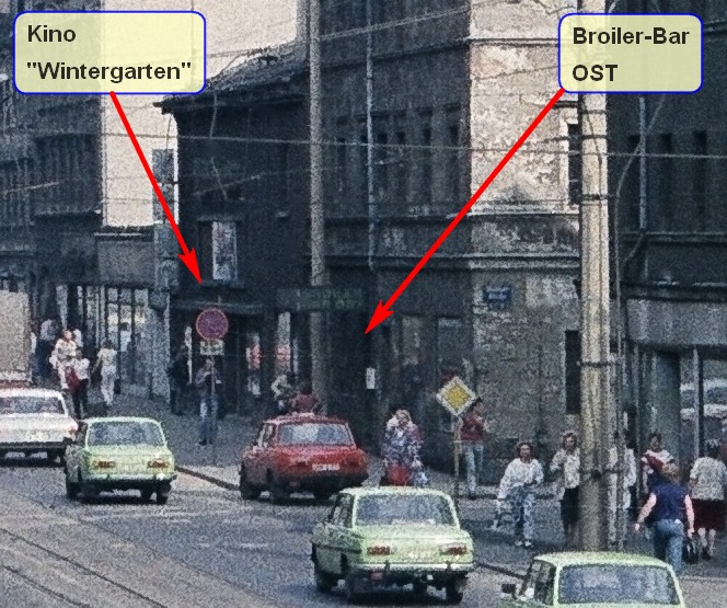 Bildausschnitt mit dem legendären Kino „Wintergarten“ und der ebenfalls für seine Grillhähnchen-Qualität legendären „Broilerbar OST“ im/am Gebäude des ehemaligen Restaurants „Bergschlößchen“, Mitte der 90er Jahre abgerissen.