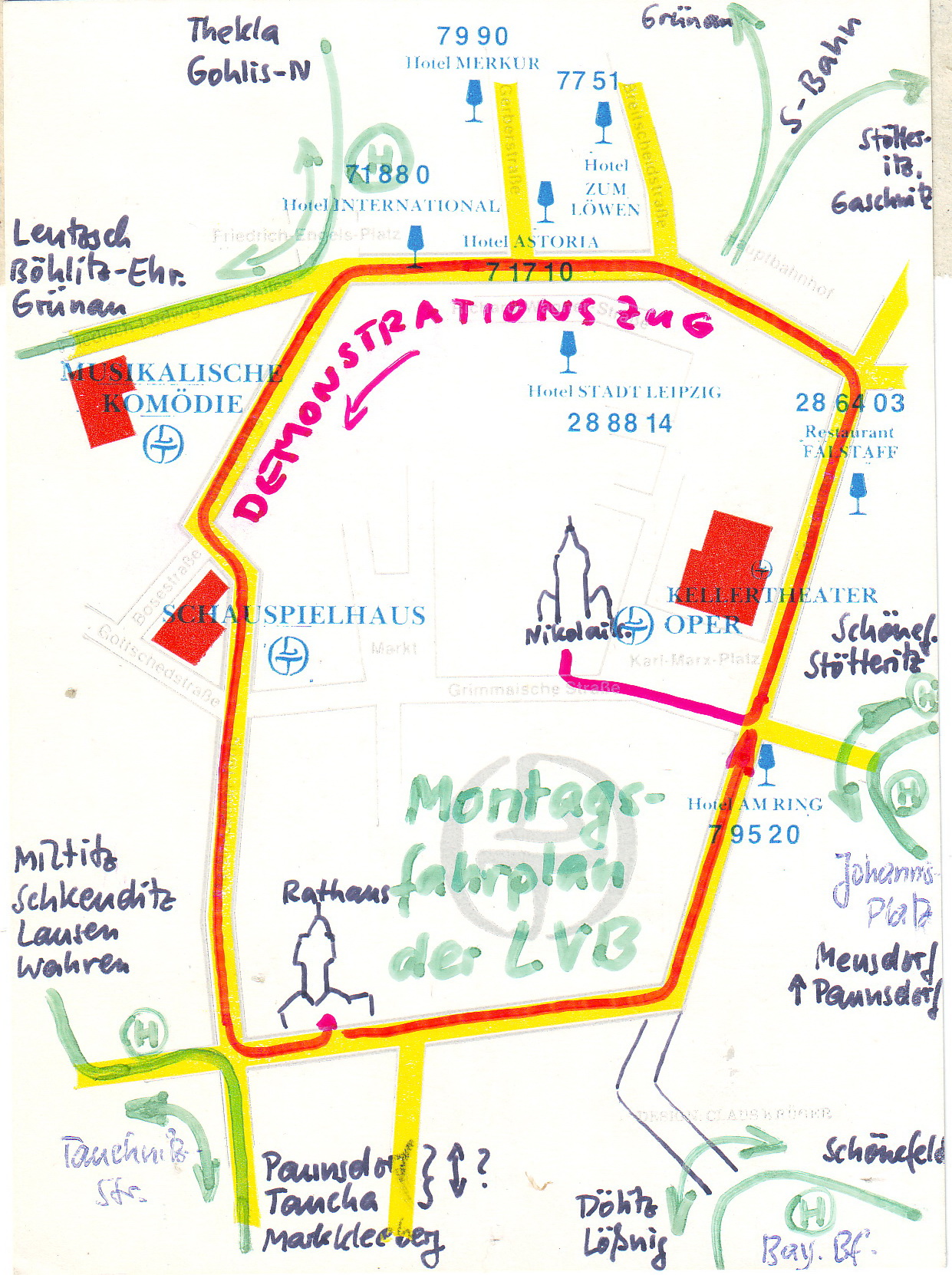 Wir wohnten damals im Osten Leipzigs in der Neustädter Straße und von dort aus konnte man per pedes in gut 15 Minuten in der Stadt sein. Ich musste an dem Abend auch zu Fuß in die Stadt laufen, weil wegen der Montagsdemos keine Straßenbahn über den Ring fahren konnte, es gab sogar einen Extra-Demo-Umleitungs-Fahrplan.