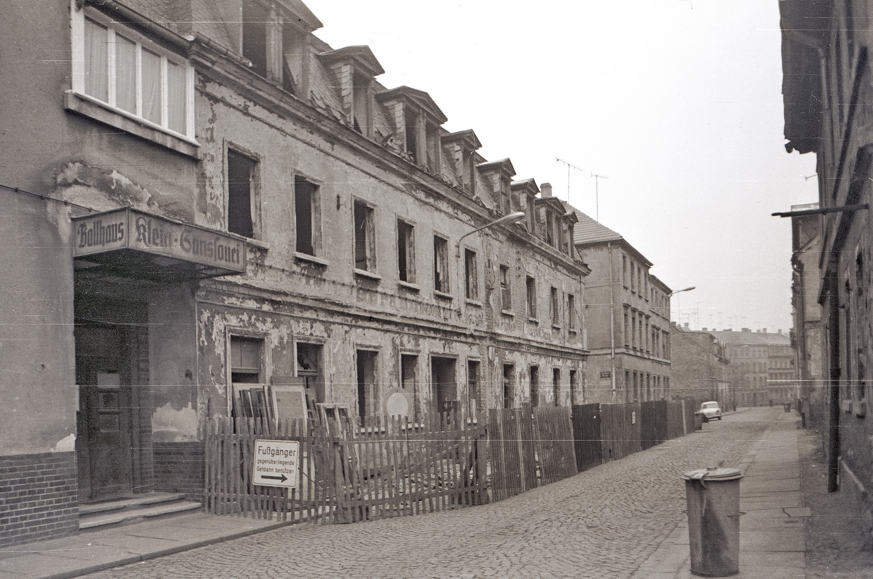 - an Stelle des Hauses Nr. 5 eine Lücke – dort durfte seinerzeit nicht gebaut werden, weil die überwölbte Rietzschke die Straße und Grundsstücksparzellen unterfloß,