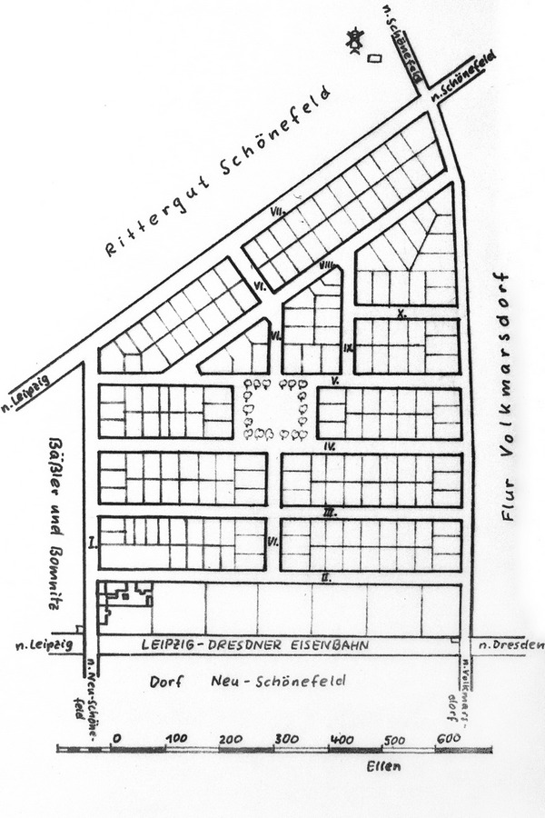 Das städtebauliche Projekt aus dem Jahr 1866 sah für das zu bebauende Areal im Schönefelder Neuen Anbau die Neuanlage von zehn Straßen, zunächst bezeichnet mit I bis X, vor.
