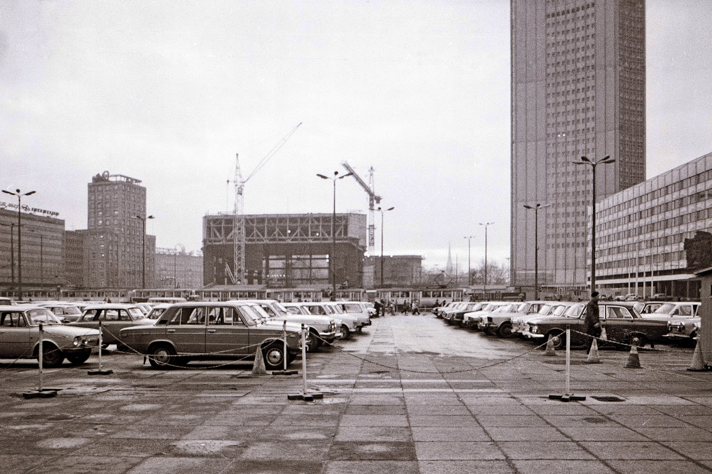 Das Richtfest des Neuen Gewandhauses zu Leipzig fand am 29. Dezember 1978 statt. Ich konnte aber erst nachmittags ein etwas tristes Bild auf dem Karl-Marx-Platz mit der Gewandhaus-Baustelle und dem unschönen Parkplatz aufnehmen – bei Schmuddel-Wetter mit Nieselregen bei etwa + 11 °C.