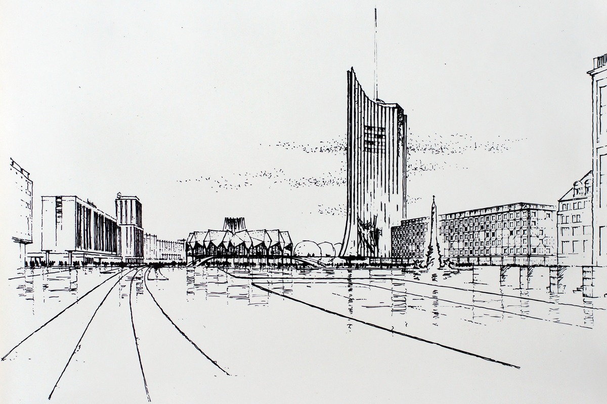 Eine frühe Projekt-Skizze der Henselmann-Gruppe zu den Uni-Gebäuden am Leipziger Karl-Marx-Platz, aus dem Jahr 1968