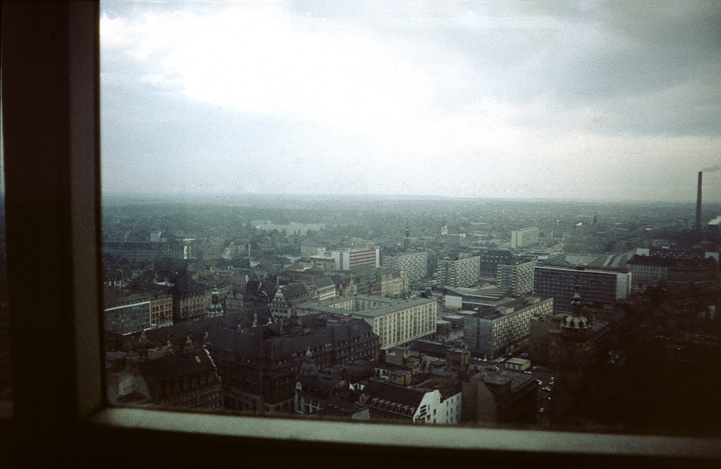 Im Uni-Bereich des Hochhauses gab es auch eine Kantine und wir Studenten hatten bald herausbekommen, dass man mit dem Fahrstuhl zum preiswerten Kaffeetrinken für 30 Pfennige zur 12. Etage (soweit ich mich erinnere) hochfahren musste. Und wenn man mal einen Ausblick über die Stadt genießen wollte, dann sind wir manchmal bis zur 25. Etage zu den Räumen der Gesellschaftswissenschaftler hochgefahren und haben dort aus dem (geschlossenen) Fenster geschaut. Eine klare Weitsicht gab es aber zu Beginn der 70er Jahre wie man auf dem Bild sieht sehr selten.