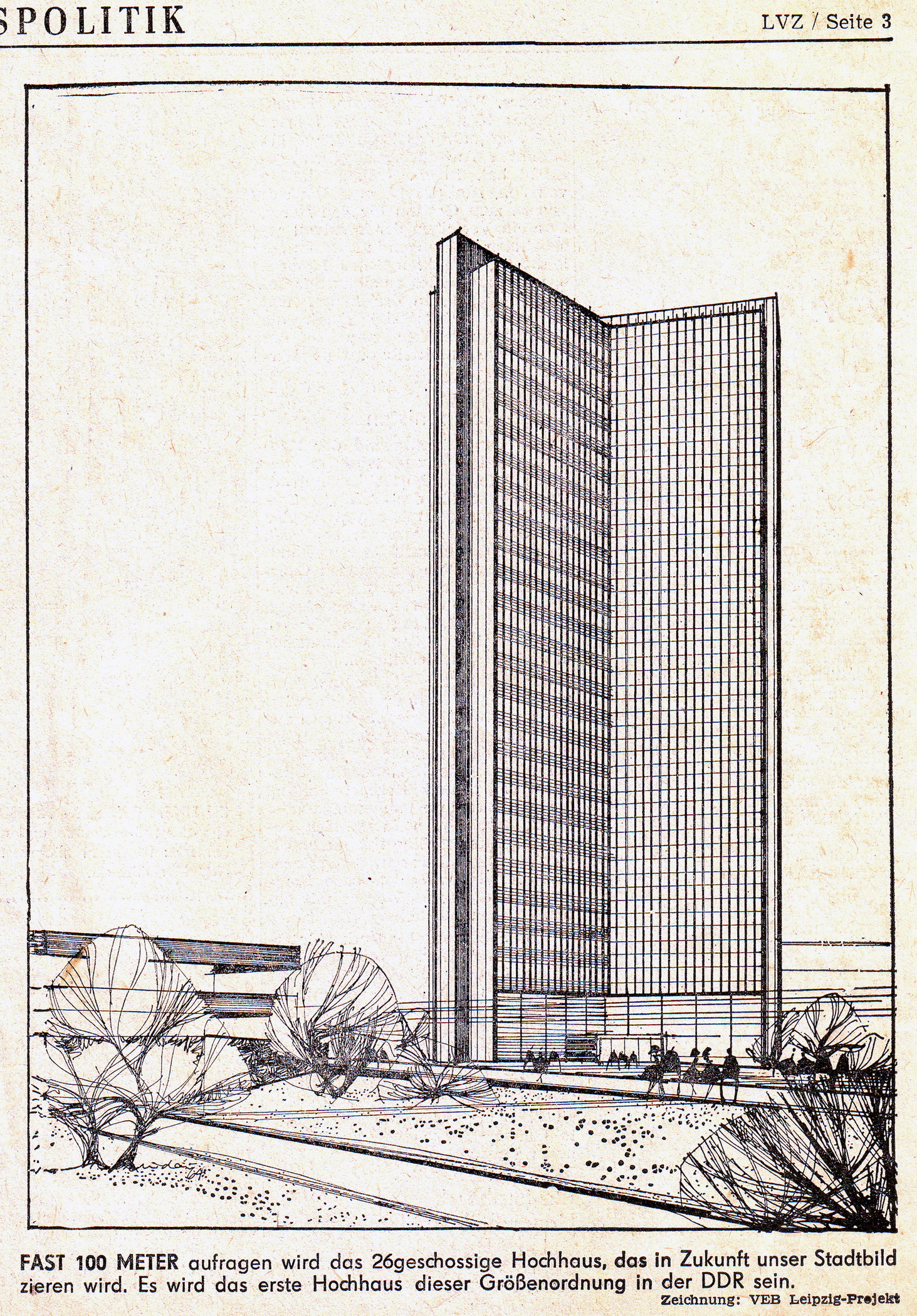 In einem LVZ-Beitrag vom 18. April 1965 wurde auf Seite 3 unter anderem über ein projektiertes 26-geschossiges Hochhaus am Karl-Marx-Platz (ungefähr an der heutigen Stelle des Uni-Riesen) geschrieben. Der Kern der Rohbau-Konstruktion sollte in Gleitschal-Bauweise ausgeführt werden. Für dieses im Grundriss Y-förmige Hochhaus mit etwa 1.300 Büroplätzen wurde eine Bausumme von rund 35 Millionen Mark veranschlagt. Für den Bereich der Innenstadt waren noch weitere imposante Hochhaus-Neubauten vorgesehen: