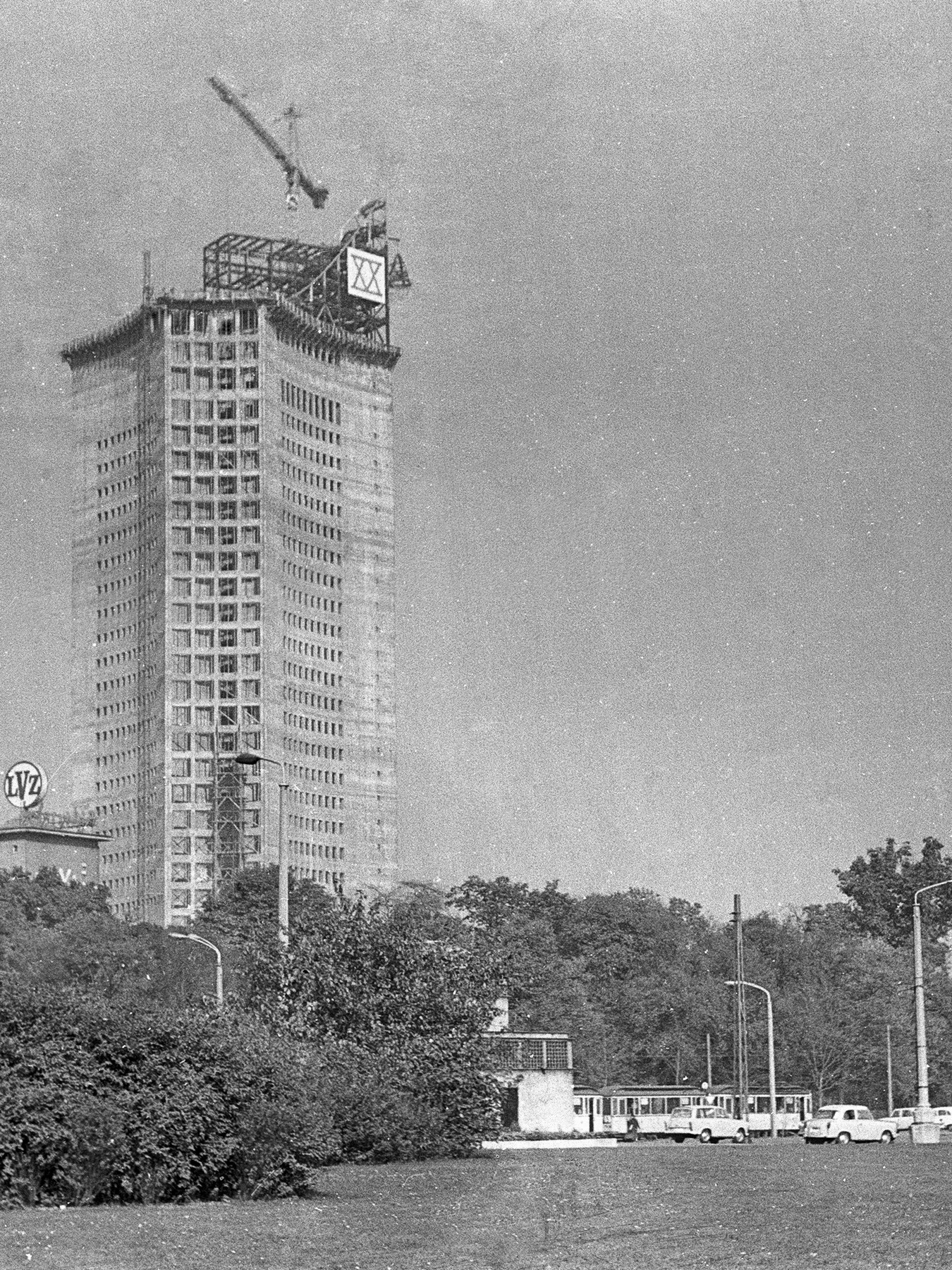 Das linke Bild habe ich vom Roßplatz aus aufgenommen. Auf dem Ring herrscht (wie immer) reger Straßenverkehr, rechts die Einmündung zur Grünewaldstraße. An der ,,Spitze“ des Rohbaus ist die Richtkrone an zu erkennen, auch die große Tafel mit dem ,,XX“ (20. Jahrestag). Das Richtfest fand am 6. Oktober, also am Vortag des ,,Republik-Geburtstags“ statt. Das Gebäude ist 142,5 m hoch, mit den Antennen-Aufbauten sind es 155,4 m.