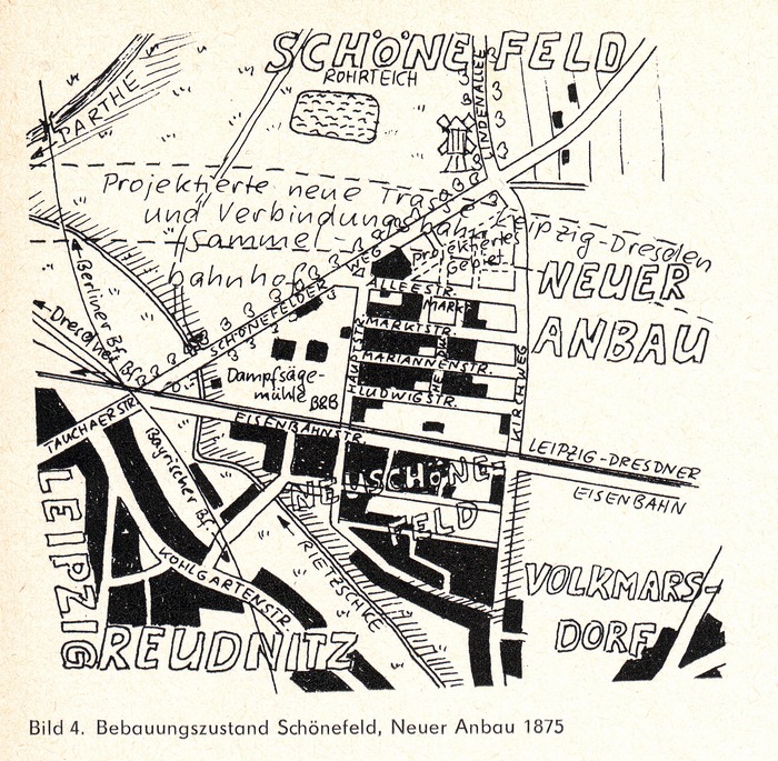 ,, … Erst als Ende 1866 von Julius Müller ein Wohnhaus errichtet und schon ein weiterer Bauplatz von Herrn Lägel erworben worden war, drängte die Aufsichtsbehörde zur Einverleibung des ,,neuen Bebauungsplatzes“. Da der Gemeinderath nicht ohne weiteres darauf einging, wurde die provisorische Ueberweisung des Bäßler & Bomnitz’schen Besitzthums und der entstandenen Wohnhäuser Müllers und Lägels angestrebt, ohne für Neuschönefeld Erfolg zu haben. Schönefeld übernahm es. Die Verhandlungen wurden abgebrochen, da die Rittergutsherrschaft die gestellten Bedingungen nicht anerkannte, bis im Jahre 1872, wo fortwährende Neubauten entstanden und es ein bevölkerter Ortstheil zu werden versprach.“