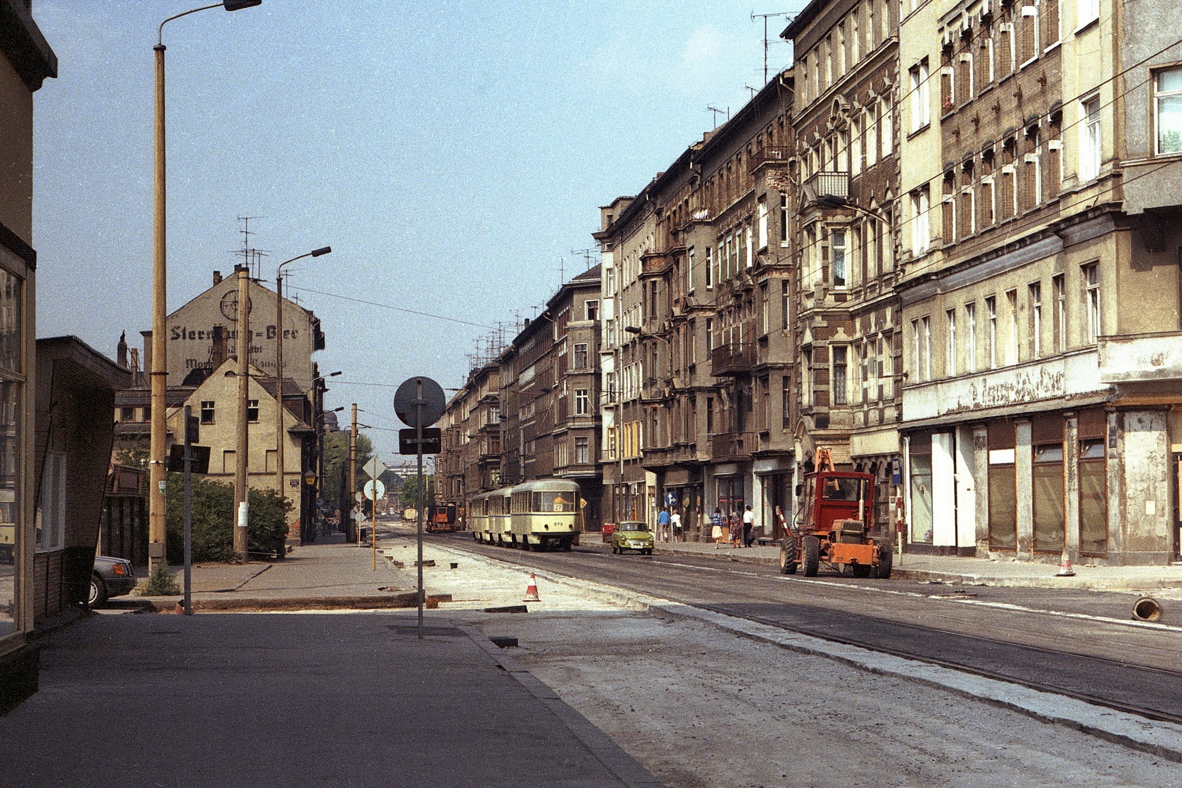 Das Bild hatte ich von der stadtwärtigen Straßenbahn-Haltestelle an der Einertstraße mit meiner Exakta Varex VX mit ORWO-Film NP20 aufgenommen.