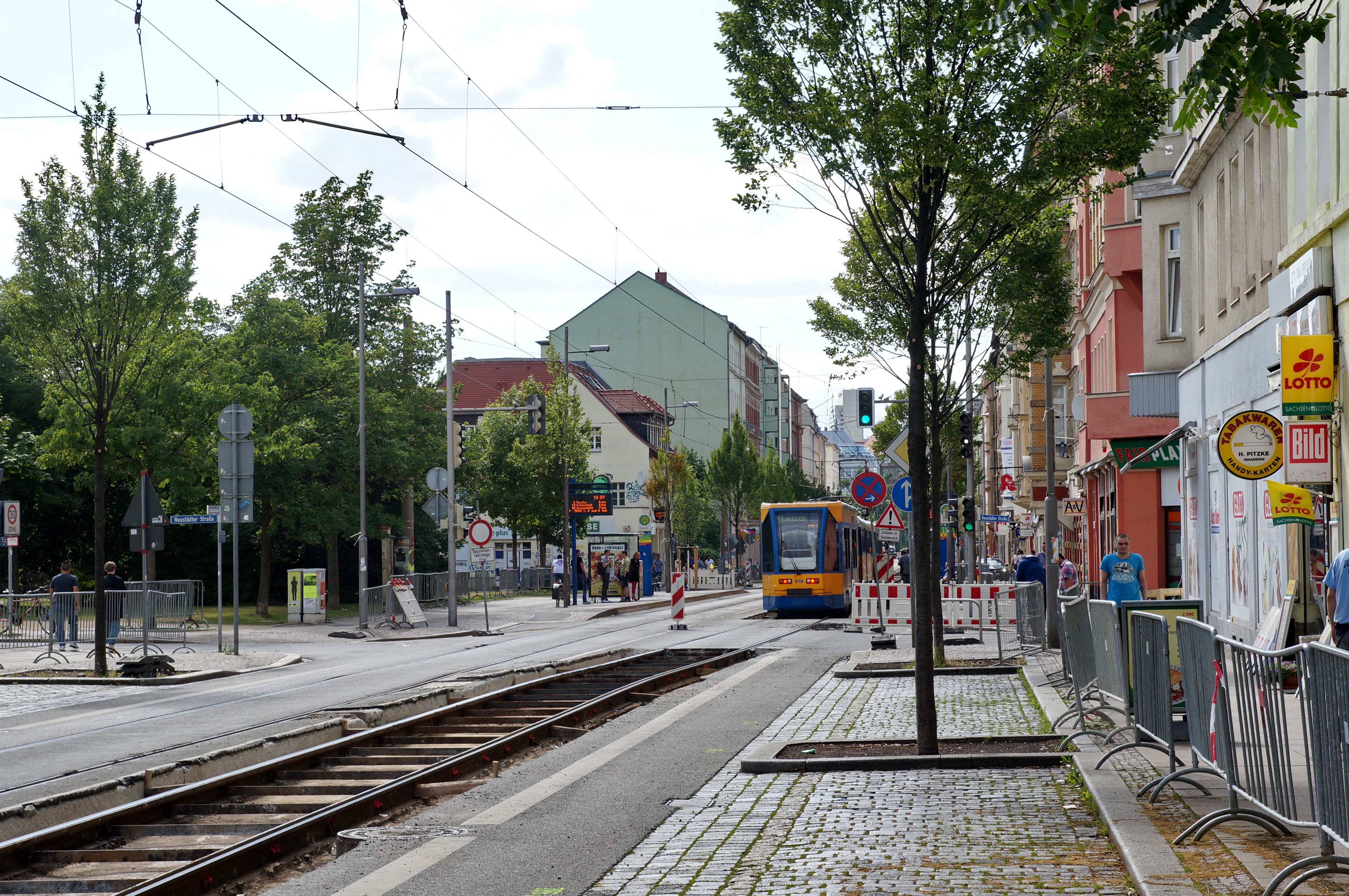 Die Straßenbahn-Schienen sind wieder i.O. und ein Werbe-Zeppelin kreist gerade über der Leipziger Ostvorstadt.