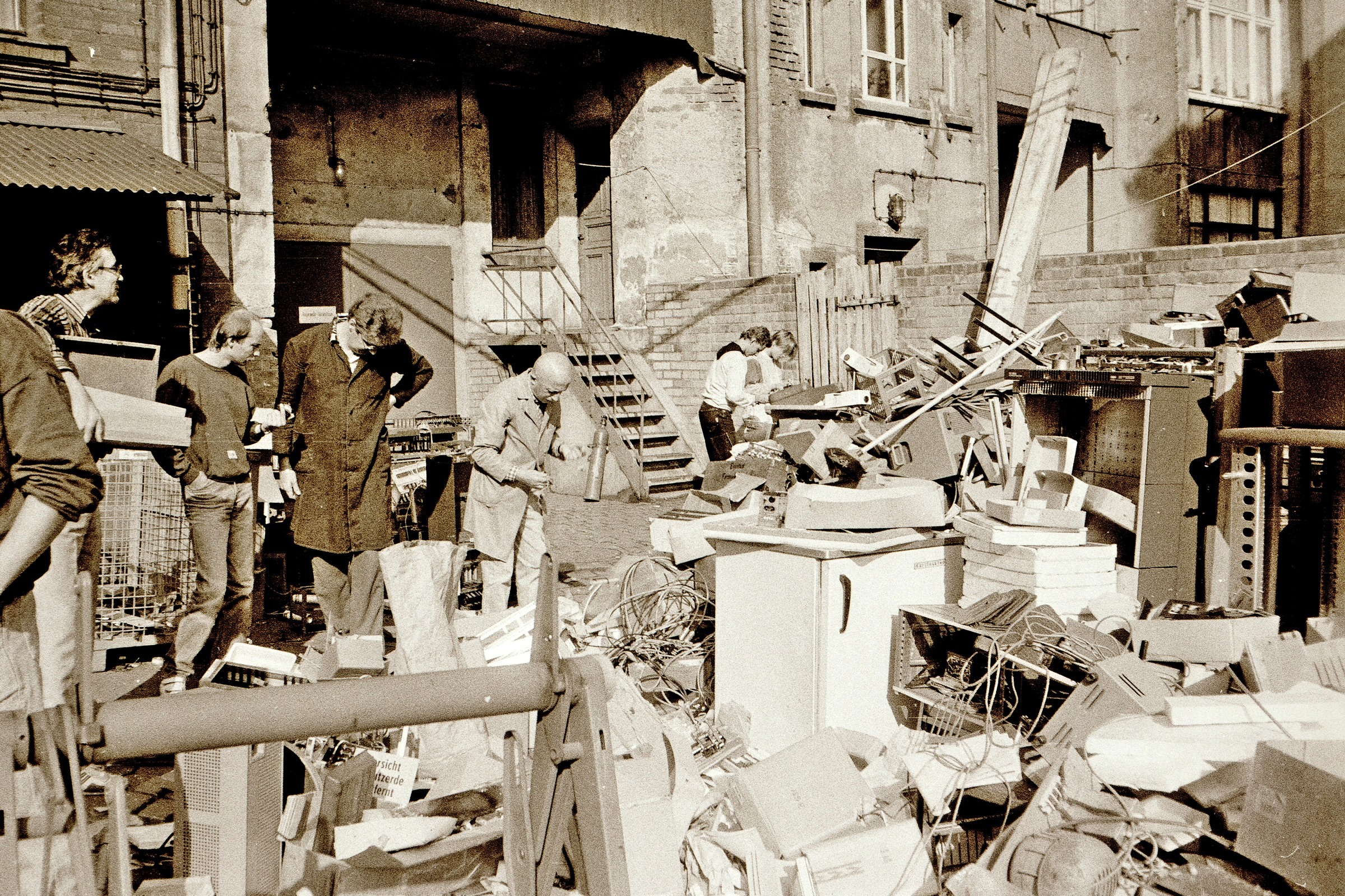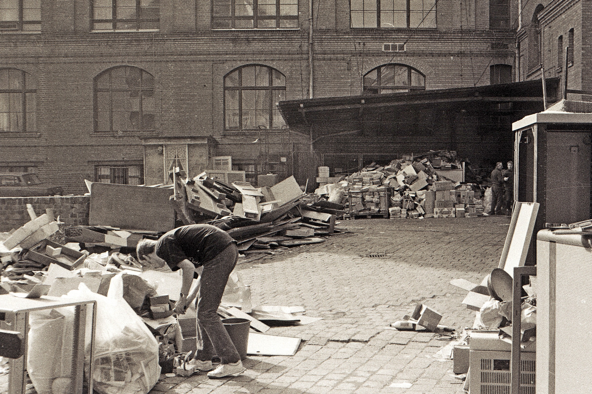 Das klingt zwar positiv, betraf aber nur einen Teil der Belegschaft. Nicht so im Werksteil 2, dem Entwicklungsstandort des Werles. Der wurde abgewickelt. Hier auf den folgenden Bildern große Akten- und Equipmentberge im Hof der Eichstädtstraße 11 (Entwicklungsstandort der Vermittlungstechnik).