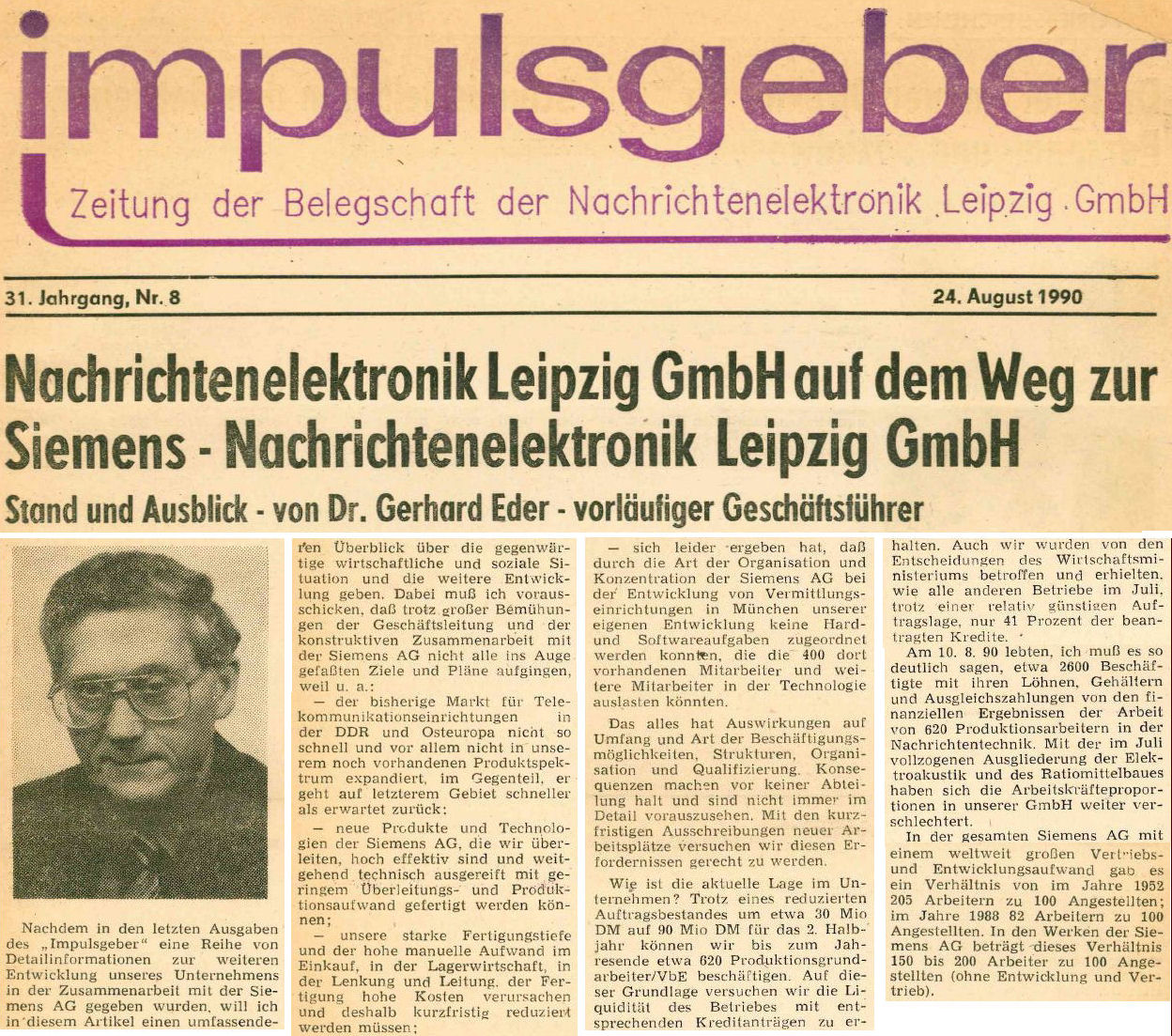 Der ,,impulsgeber“, nun als Zeitung der Belegschaft der Nachrichtenelektronik Leipzig GmbH, wurde mit dem 1. September 1990 eingestellt. Bemerkenswert ist die letzten Ausgabe vom 24. August 1990. Darin war eine sehr aufschlussreiche und interessante Zusammenfassung zu Stand und Ausblick der Verhandlungen der Geschäftsleitung der Nachrichtenelektronik Leipzig GmbH mit der Siemens AG abgedruckt. Zum Nachlesen im linken Beitrag.