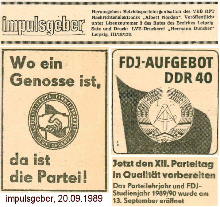 Im Fernmeldewerk gab es in dieser Zeit eine Betriebszeitung ,,impulsgeber“. Herausgeber war natürlich die Betriebsparteileitung (Partei = SED) und damit war auch klar, was an Information und Desinformation geschrieben wurde. Im Beispiel der Betriebszeitung rechts gegen Ende September 1989 war die SED-Welt scheinbar noch in Ordnung: es gab Artikel über clevere (SED-)Genossen oder vorbildliche FDJler (FDJ = Freie Deutsche Jugend, ,,Kampfreserve der Partei“). Den vorzubereitenden XII. Parteitag der SED (vorgesehen im Jahr 1990) gab es letztendlich nicht mehr (!)