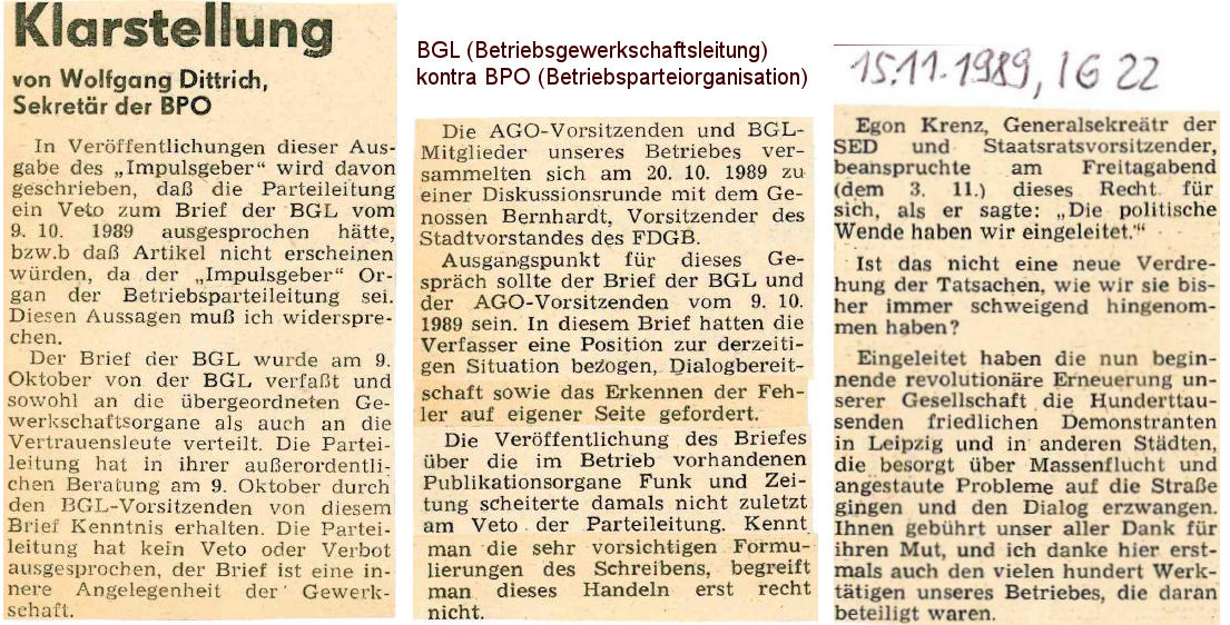 Aber, ab Ende Oktober hat sich das schnell geändert. Die neue Abstimmung mit den Füßen auf den Leipziger Straßen hatte auch Auswirkungen auf die Inhalte von Betriebszeitungen gehabt – auch im ,,impulsgeber“ unsres Betriebes. Stellvertretend hier als Beispiel im impulsgeber Nr. 22, vom 15. November 1989, da muss sich die Betriebsparteileitung gegenüber dem Veröffentlichungsverbot eines offenen Gewerkschaftsbriefes zu den Ereignissen vom 9. Oktober 1989 in Leipzig rechtfertigen und von der Gewerkschaftsleitung wird der ,,neue Wende-Kurs“ von Egon Krenz scharf kritisiert. Das waren im Jahr 1989 in einer Betriebszeitung völlig neue und ungeahnte Töne !