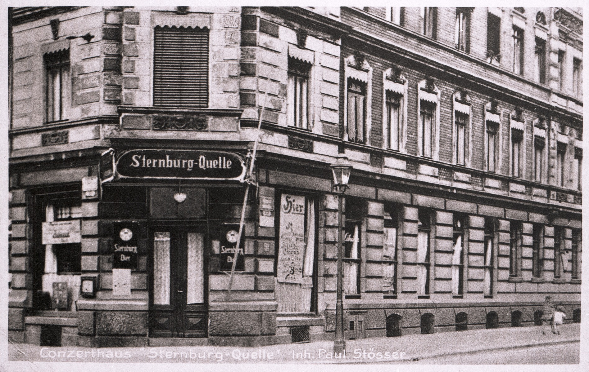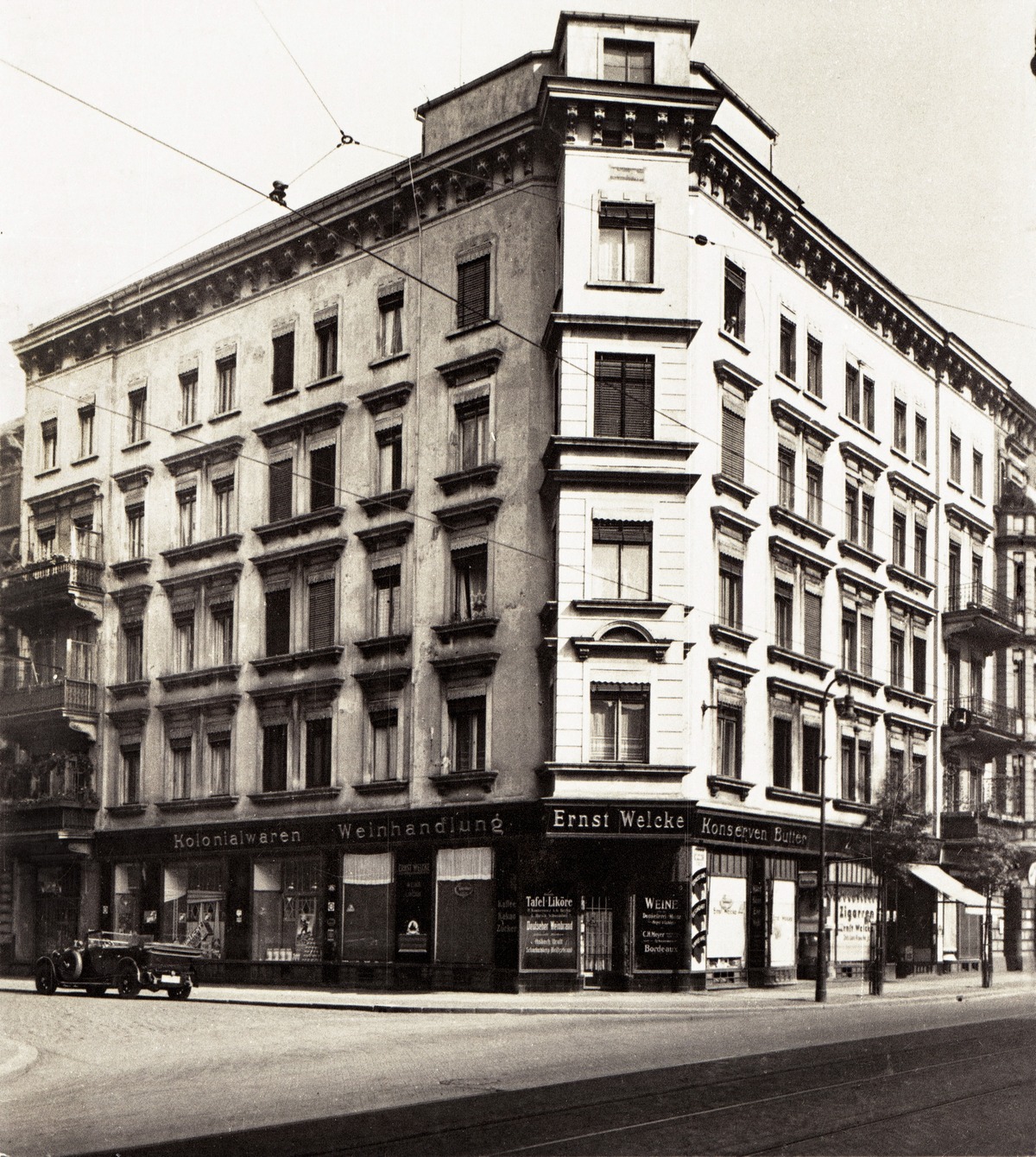 Als Bonus von diesen Eckhäusern noch zwei Bilder aus der Zeit um 1925: Nr.25 mit der Eck-Gaststätte ,,Sternburg-Quelle“(Postkartenbild links) und Nr. 27 (Foto rechts) mit der großen Ladenzone „Ernst Welcke“ Kolonialwaren und wie man sieht einem großen Sortiment: Weinhandlung, Konserven, Butter, Zigarren …