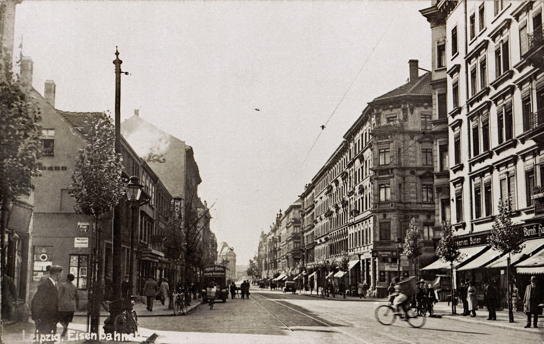 Die Qualität des Ausgangsmaterials als gelaufene Postkarte war nicht sooo toll, auch die (fast) händische Beschriftung „Leipzig, Eisenbahnstr.“ fühlt sich mehr nach Amateur an.