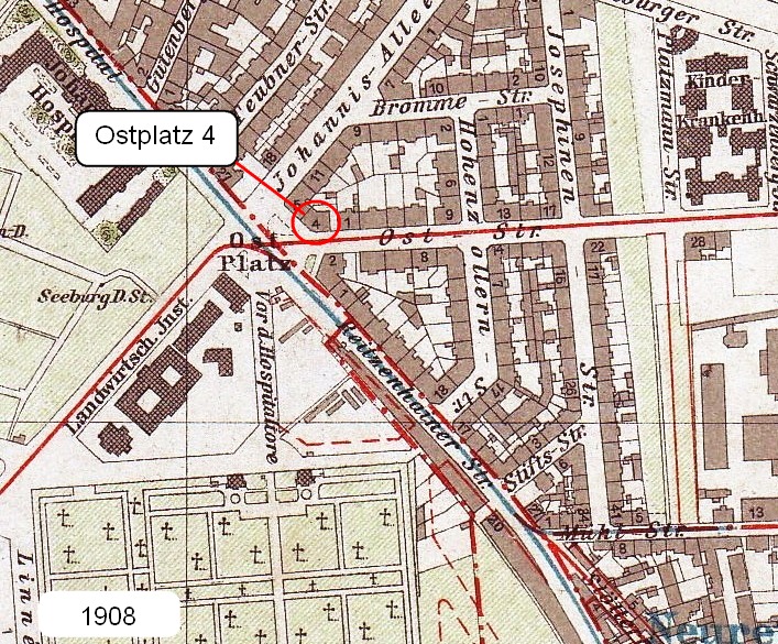 - Ab 1919 residierte am Ostplatz 4 die Firma Bading & Co. GmbH von Frau Käthe Bading, welche vermutlich mit chemischen und technischen Produkten handelte. Diese Firma war dort bis 1936 ansässig.