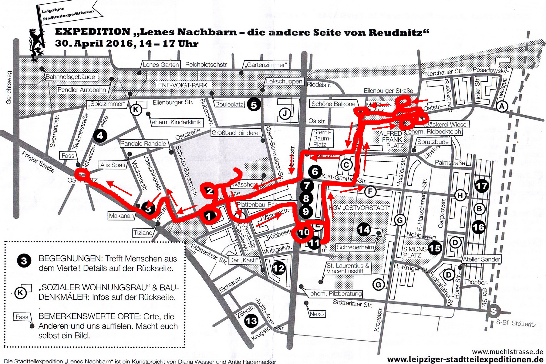 Als Neugierige waren meine Frau und ich pünktlich zu Exkursionsbeginn um 14 Uhr im Stadtteilzentrum Mühlstraße 14 (mit vielen anderen Interessierten) startbereit erschienen und erhielten von Antje einen temporären Stadtplan mit vielen Stationen und Hinweisen, um das Viertel individuell zu erforschen und mit Leuten aus Reudnitz Gespräche zu führen. Auf dem Plan habe ich unsere Erkundungsroute skizziert:
