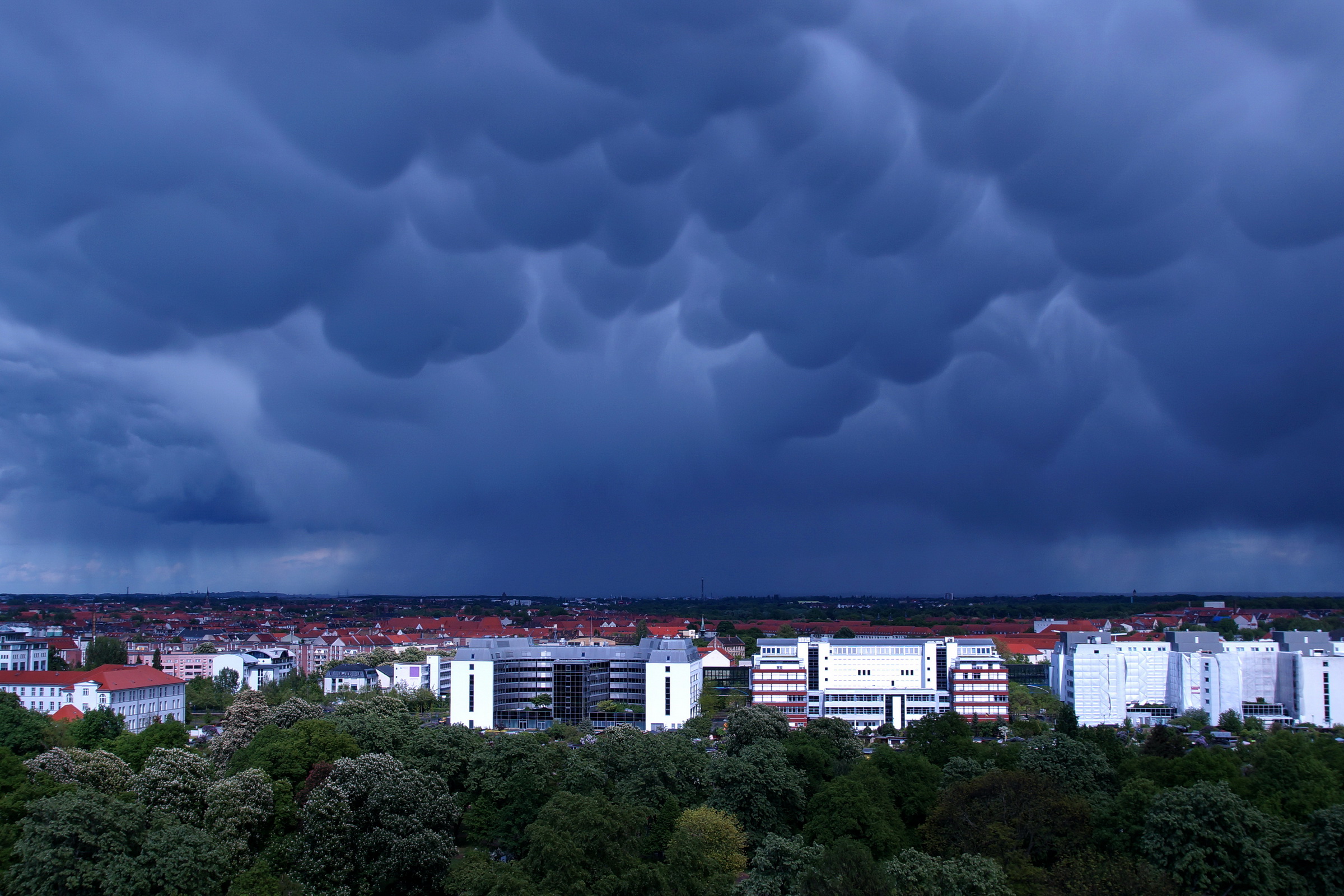Heute Nachmittag, am Pfingstsonntag kurz nach 4, konnten wir in Richtung Osten überm Friedenspark beutelförmige Mammatus-Wolken beobachten.
