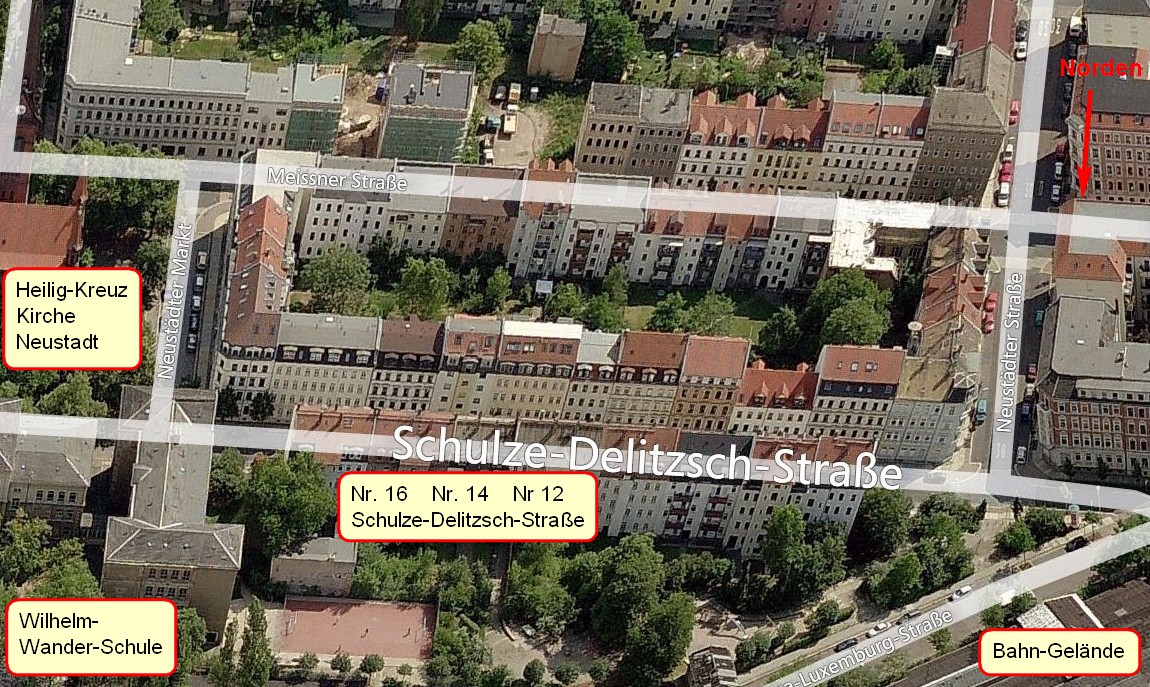Laut Angaben in den Leipziger Adressbüchern (LAB), den alten Adressbüchern der Leipziger Ostvorstädte und eigenen Ermittlungen habe ich über die Häuser in der Schulze-Delitzsch-Straße 12, 14 und 16 folgendes herausgefunden: