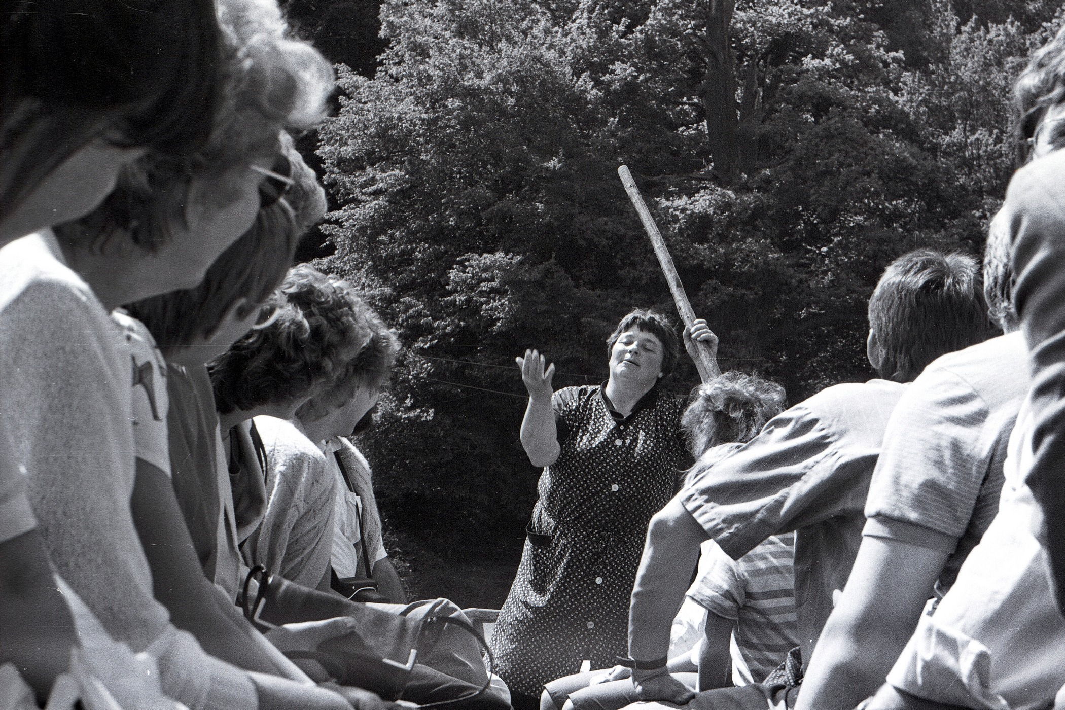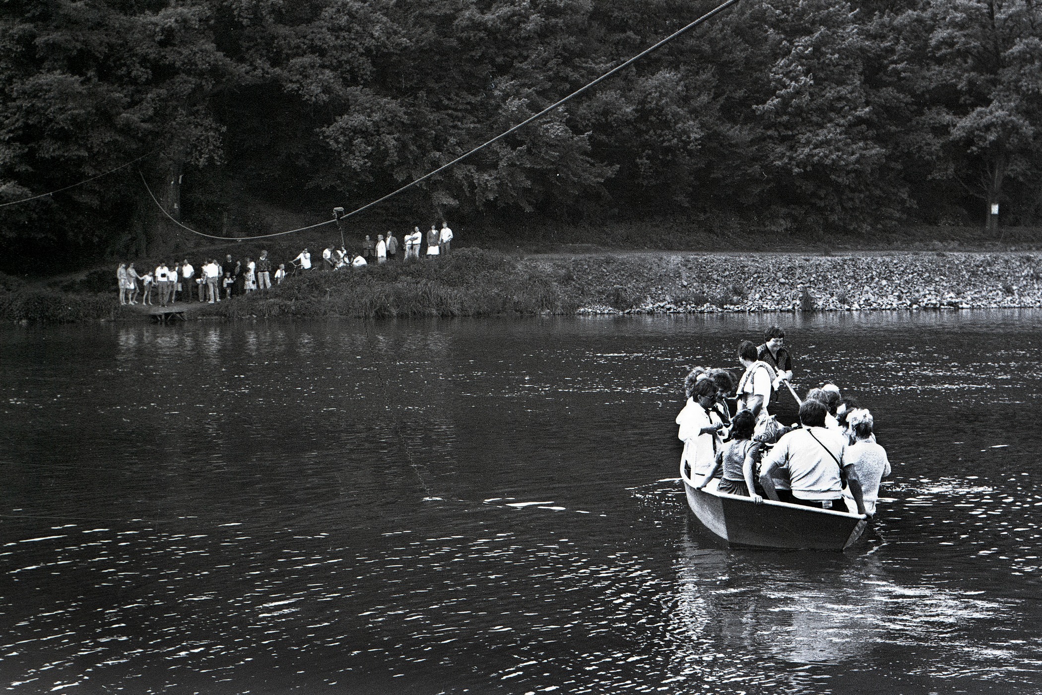 Im Filmarchiv habe ich auch noch ein paar Bilder von unserem Pfingstausflug am 14. Mai 1989 nach Höfgen gefunden. Da war richtig Hochbetrieb an der Fähre und Fährfrau Brigitte Müller hatte ohne Pause zu tun – auch ihr Mundwerk stand nie still. Eine Woche vor Pfingsten hatten in der DDR die sehr umstrittenen manipulierten Kommunalwahlen stattgefunden. Frau Müller wetterte dagegen, dass sich fast die Bootsbalken bogen. Oh, da war sie so richtig in Fahrt gekommen!