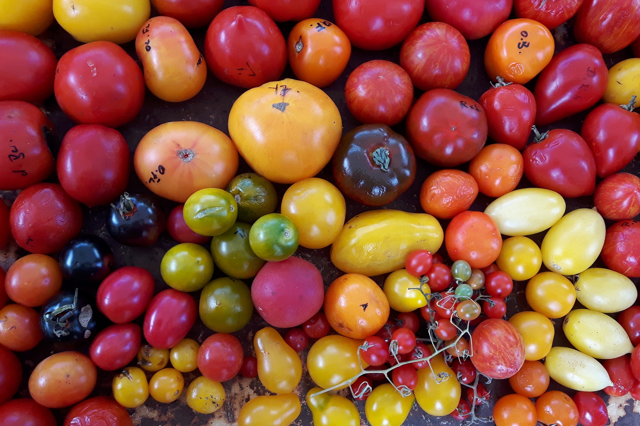 Heute fand im Botanischen Garten der Leipziger Universität der gut besuchte herbstliche Pflanzenmarkt statt. Das haben meine Frau und ich uns bei mittäglichem Sonnenschein nicht entgehen lassen. Unter anderem haben wir auch alte, fast vergessene Apfel- und Tomatensorten bewundert. Tomaten sind nicht nur ,,EU-rund“ und rot – auf dem Bild ein kleiner Eindruck farbiger Tomatenvielfalt. Was könnte das alles sein? Birnenförmige gelbe Stabtomaten, violettfarbene Fleischtomaten, fast schwarze Cherry-Tomaten, gestreifte Tigerella-Tomaten, eierförmige blassgelbe Tomaten und viele andere Sorten, die wir noch nie gesehen hatten …