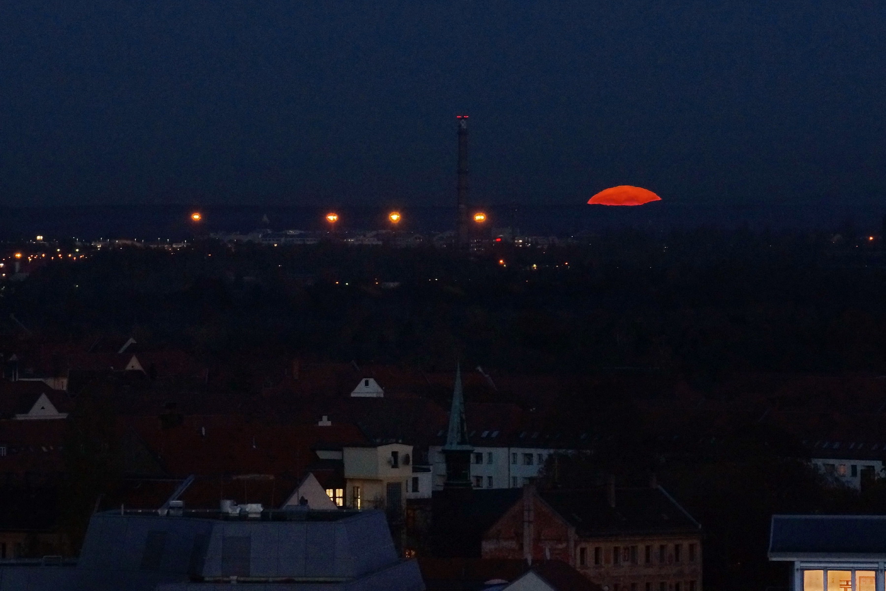 Ich habe die Sony A57 mit dem Tamron SP 70 – 300 auf mein Manfrotto-Stativ gepackt, das Zoom auf 300 mm herausgedreht, ISO1600 vorgewählt und so ab 16:56 bis 17:05 Uhr den Mondaufgang in Richtung Osten fotografiert. Links der RAW-Schornstein bei Engelsdorf.