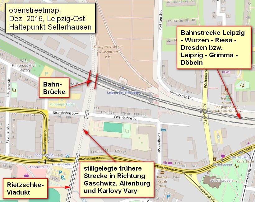 Damals gab es übrigens zwei Haltepunkte Sellerhausen: einen oben auf der Brücke für die S-Bahnlinie A zwischen Hauptbahnhof-Gaschwitz und einen unteren, auf der S-Bahnlinie B zwischen Leipzig und Wurzen.