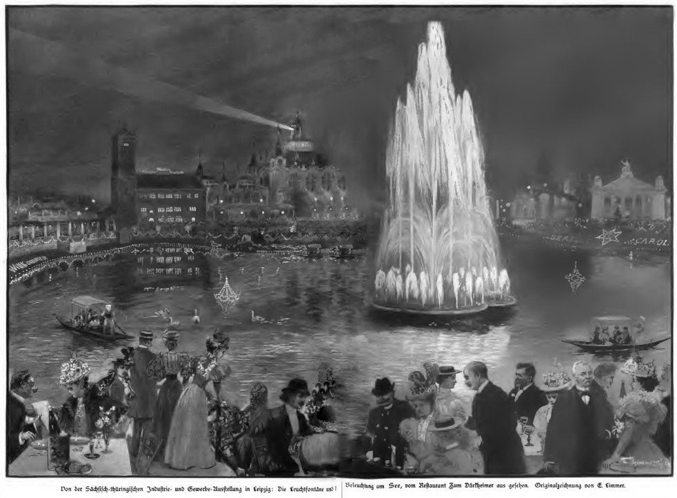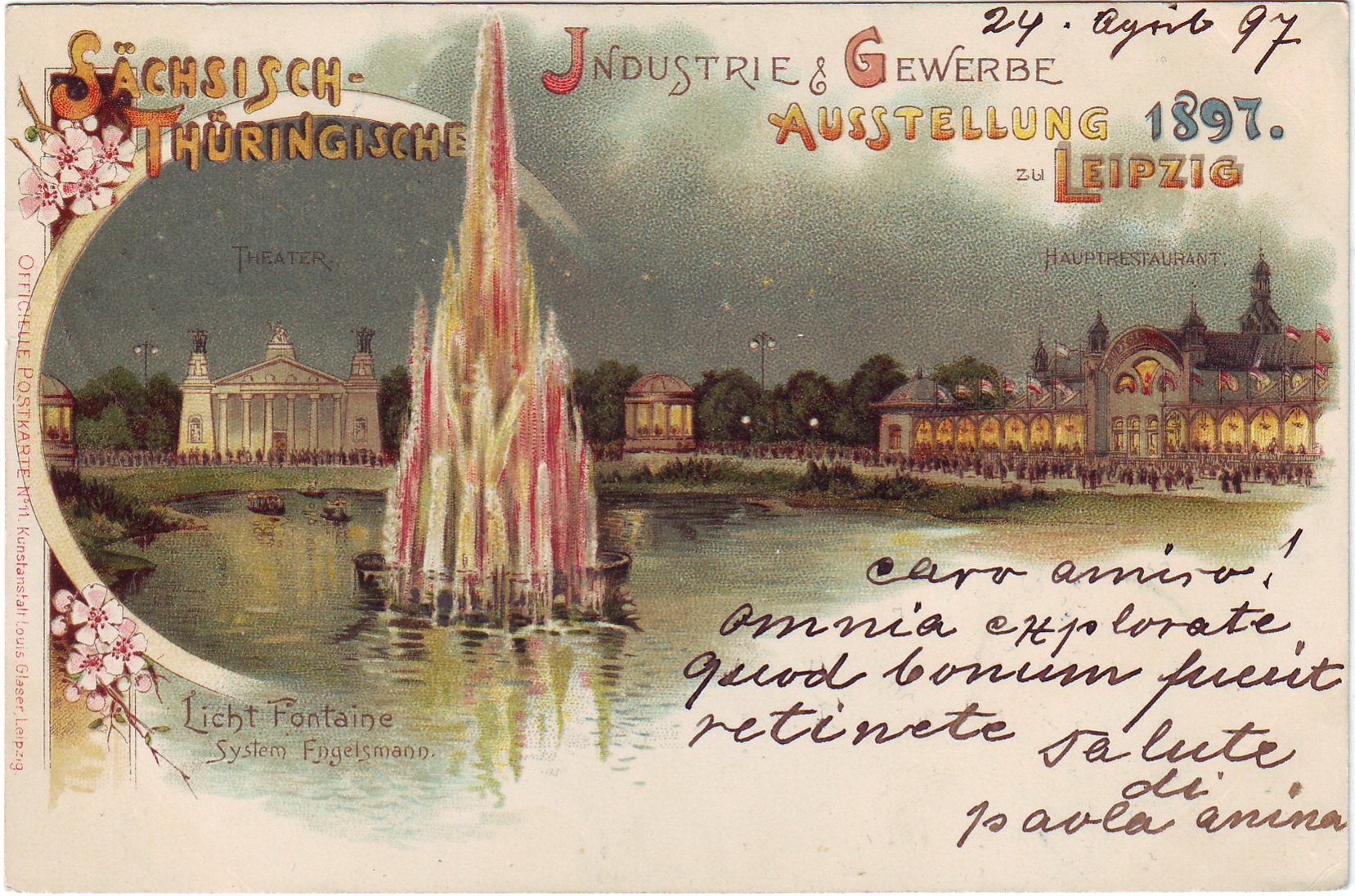 Auf der oben abgebildeten Postkarte ist ein interessanter Blick über das gesamte Ausstellungsgelände zu sehen: rechts die Eingangs-Obelisken am Rondell der Carl-Tauchnitz-Straße (heute befindet sich hier der Platz mit dem Kreisverkehr), nach links der Allee folgend das große Bassin bis zur damaligen Hauptbrücke über das Pleiße-Hochflutbett zur großen Industriehalle. Links ist der Inselteich mit der Fontäne zu sehen. Weil diese Postkarte aber aus der bereits 1896 erschienenen Karten-Vorserie stammt, fehlen einige der erst später hinzugekommenen Gebäude (z.B. das Theater, das Panorama, die Fahrradhalle …).
