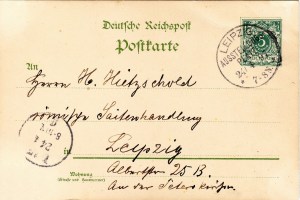 Die Schwester meiner Großmutter Berta Maria Richter hat mir eine umfangreiche Postkartensammlung überlassen, in der auch am ersten Ausstellungstag, dem 24. April 1897, original gelaufene Postkarten mit dem Stempel vom ,,AUSSTELLUNGS-PLATZ“ enthalten sind. Man beachte den Zeitstempel der Einlieferung ,,7 – 8 N.“, also am frühen Abend zwischen 19 und 20 Uhr und demgegenüber den Stempel mit der Auslieferungszeit ,,24.4. 8 – 10 N.“, demnach noch am gleichen Tag zwischen 20 und 22 Uhr (das ging ja sehr flink !).