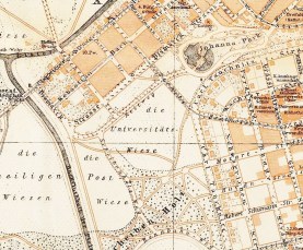 Mitte der 1890er Jahre dehnten sich um das Hochflutbett der Pleiße noch sumpfige Wiesen. Auf dem Plan der Stadt Leipzig im linken Bild kann man noch die Universitätswiese, die Postwiese und die heiligen Wiesen westlich der Carl-Tauchnitz-Straße erkennen. Das sollte sich aber bald ändern. Im Rahmen der Vorbereitung einer großen Leipziger Industrie- und Gewerbeausstellung begannen im Mai 1895 auf diesen Wiesen Ausfüllungsarbeiten und bereits im Februar 1896 wurde mit der Errichtung von Hochbauten begonnen. ,,Der Ausstellungsplatz enthält ungefähr 400.000 Geviertmeter Fläche. Seine Herstellung als Park erforderte eine Bewegung von mehr als 300.000 Kubikmeter Boden. Alle Arbeiten wurden so gefördert, dass die Ausstellung rechtzeitig und vollendet am 24. April 1897 eröffnet werden konnte.“ [Literatur #2]
