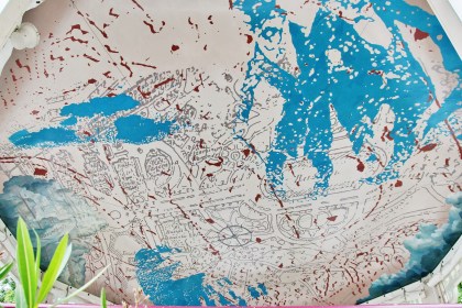 Auf den ersten Blick könnte man meinen, dass die Decke vom Musikpavillon etwas farbig gefleckt aussieht (folgendes Bild, links). Beim genauen Hinschauen kann man aber (auf dem rechten Bild) blaue Herren mit Zylindern, einen alten Plan, der an den Clarapark erinnert und ein Fadenkreuz erkennen, in dessen Mittelpunkt der heutige Musikpavillon steht. Im Musikpavillon-Journal erfährt man, dass diese 48 m² große Deckenmalerei aus einer Zusammenarbeit der Hochschule für Grafik und Buchkunst (HGB) mit Prof. Heribert C. Ottersbach und Christian Weihrauch entstanden ist und anläßlich einer Jubiläumsfeier im Jahr 2012 offiziell den Bürgern der Stadt Leipzig übergeben wurde. [Literatur #1]