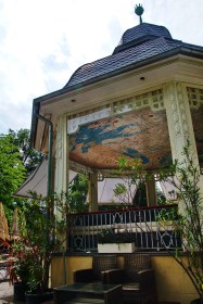 Interessantes konnten wir vor Ort in einer Journal-Sonderausgabe des Musikpavillons über die 120jährige Geschichte des Parks und an der Decke des Musikpavillons entdecken …