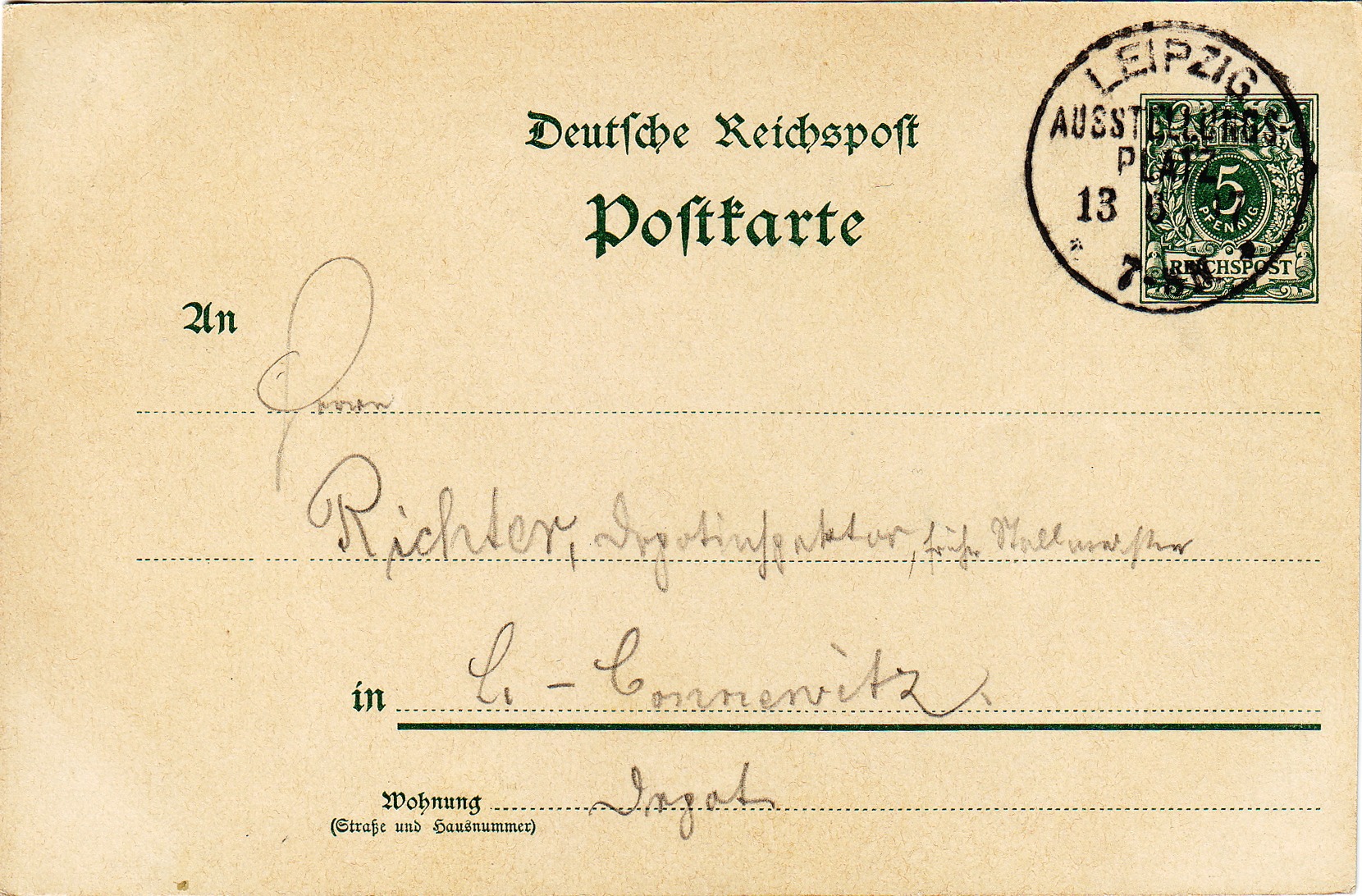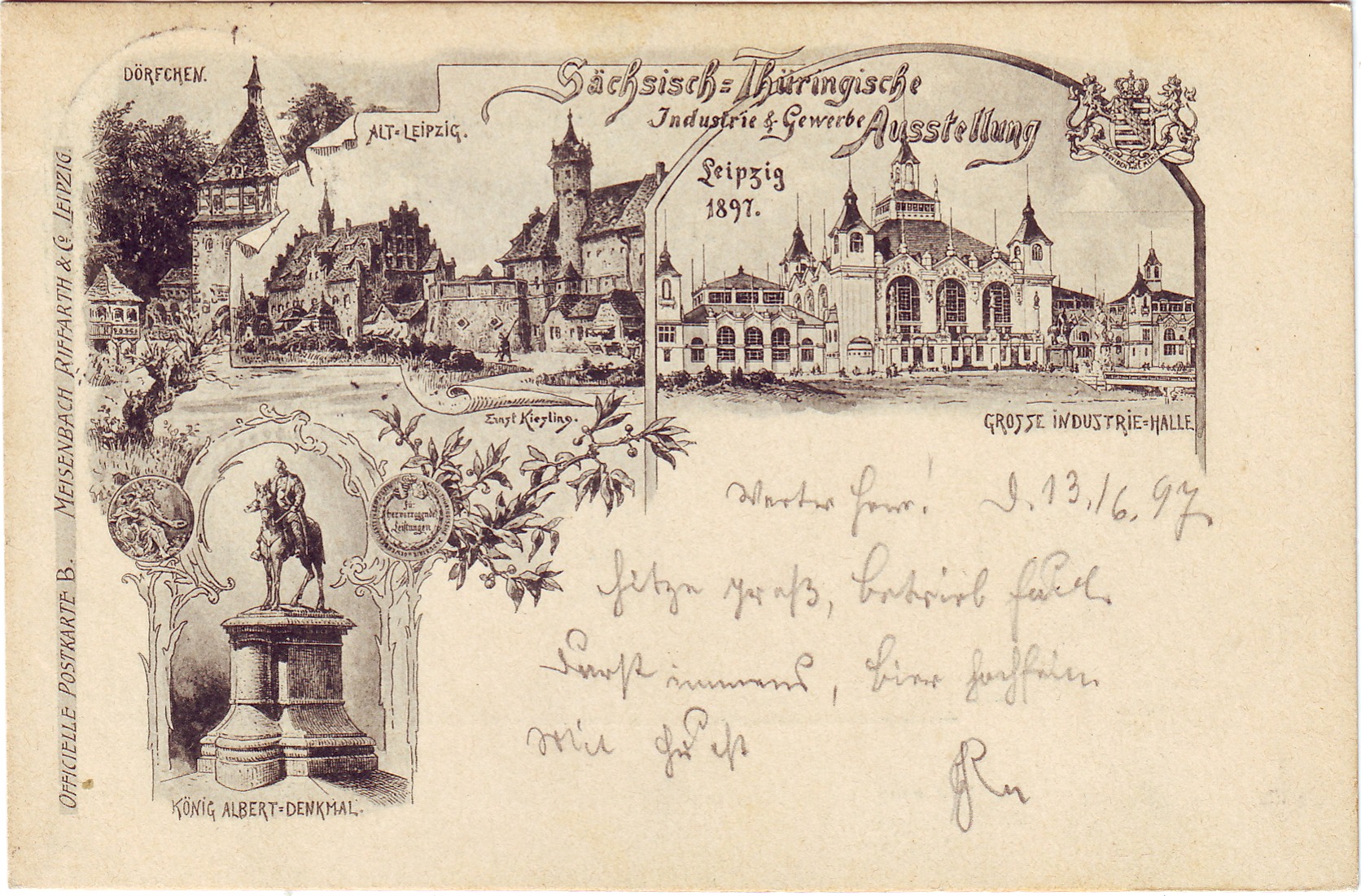 Vor genau 120 Jahren wurde in den Abendstunden 13. Juni eine Postkarte vom AUSSTELLUNGS-PLATZ der Sächsisch-Thüringischen Industrie- und Gewerbeausstellung an meinen Urgroßvater Carl Ernst Richter nach Leipzig Connewitz abgeschickt, siehe Original-Poststempel, rechts. Ernst war seit 1891 als Stallmeister im neu errichteten Pferdebahn-Depot der Großen Leipziger Straßenbahn (Blaue Linien) in Leipzig-Connewitz, in der Brandstraße Nr. 34, beschäftigt. Er war damals im Jahr 1897 41 Jahre alt und wohnte mit seiner Frau Bertha Thecla (43) und zwei Töchtern direkt im Straßenbahn-Depot.