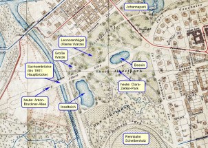 Passend zum Beitrag aus dem Leipziger Kalender von 1904 möchte ich hier nochmals auf den Ausschnitt aus dem Plan der Stadt Leipzig von 1903 aus dem Beitrag ,,Parkbesucher (1)“ verweisen (Bild, unten links). Weil die Nachträge zu diesem vom Tiefbauamt der Stadt Leipzig herausgegebenen Plan bis zum Jahr 1902 reichen, erhält man heute einen guten Überblick, inwieweit die Umgestaltung dieses Geländes fünf Jahre nach dem Ende der Ausstellung, vorangekommen waren. Die heutigen Parkstrukturen sind bereits gut erkennbar.