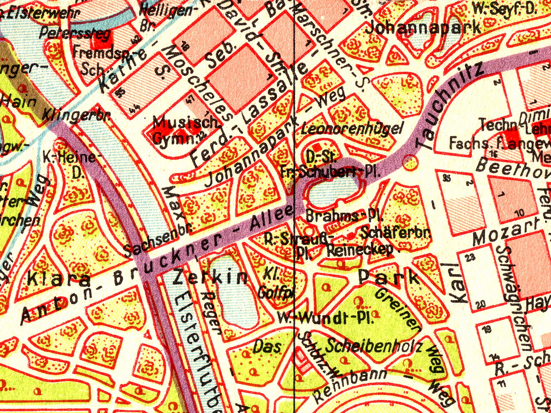 Dem habe ich einen Ausschnitt aus einem Leipziger Stadtplan aus dem Jahr 1954 gegenübergestellt (Bild rechts). Auf diesem Stadtplan kann man die vielen Bezeichnungen von Plätze, Denkmäler, Brunnen im Park ausmachen, die heute aus Platzmangel auf den Stadtplänen meistens fehlen: auch den Richard-Strauß-Platz mit dem kleinen Kreis, der den Musikpavillon darstellen soll.