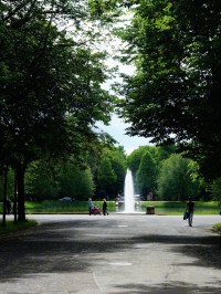 Aktuell kann aus ähnlicher Fotopostition einen fast idyllischen Parkblick mit dem alten Baumbestand der heutigen Anton-Bruckner-Allee über das Bassin mit Wasserfontäne in Richtung der Sachsenbrücke genießen (Bild rechts).