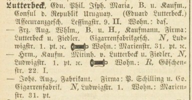 Weil unter der Wohnanschrift in der Schönefelder Hauptstraße im Jahr 1912 eine Ww. (Witwe) Johanna Lutterbeck angegeben ist, gehe ich davon aus, dass Hermann Lutterbeck im Jahr 1911 verstorben war. Die Zigarrenfabrik in der Ludwigstraße 1 wurde lt. Handelsregister im Jahr 1912 von Werner Matthias geleitet bzw. verwaltet. Das Geschäft wird dann im Jahr 1913 letztmalig in der Stötteritzer Sommerfelder Straße 36 H erwähnt.