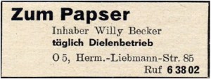 Ab Dezember 1909 versuchte Robert Mühler mit seiner ,,Ost-Schänke“ den Stammtischlern die Taler aus der Tasche zu entlocken. Laut Wirtschaftsnamen-Verzeichnis LAB wurde der Begriff bis mindestens 1913 verwendet. In der Zeit taucht aber auch der Wortlaut ,,Papser‚ auf. Wirt Mühler war nach zweijähriger Zapf-Zeit des kredenzens müde und pensionierte sich selbst.