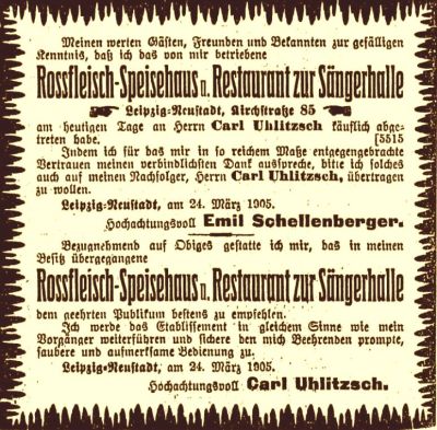 Anschließend taucht wieder der Ausdruck ,,Sängerhalle“ auf, was sich spätestens mit einer Anzeige von 1905 belegen lässt. Inhalt ist der Verkauf des ,,Rossfleisch Speisehaus‚“ und ,,Restaurant zur Sängerhalle“ von Emil Schellenberger an Carl Uhlitzsch. Offen bleibt ab wann die Restauration den Titel ,,Sängerhalle“ zurück erhielt.
