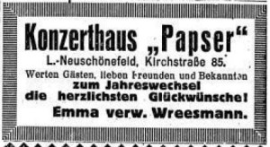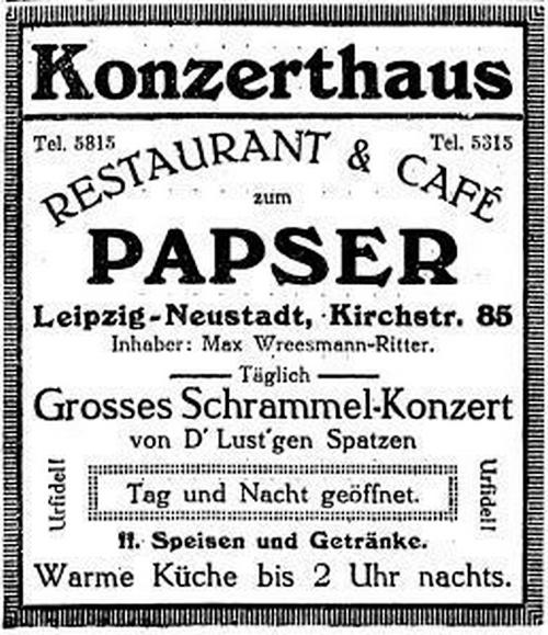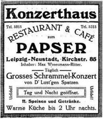 Anfang der 20er Jahre wird nur noch mit der Bezeichnung Konzerthaus ,,Papser“ geworben, wie man in den Zeitungsanzeigen aus der LVZ lesen kann. Allerdings schien sich ein Fehler in der Ortsbezeichnung hartnäckig über mehrere Jahre gehalten haben: das Gebäude an der Ecke Kirchstraße / Ludwigstraße steht auf Neustädter Gebiet und nicht in Neuschönefeld (!)