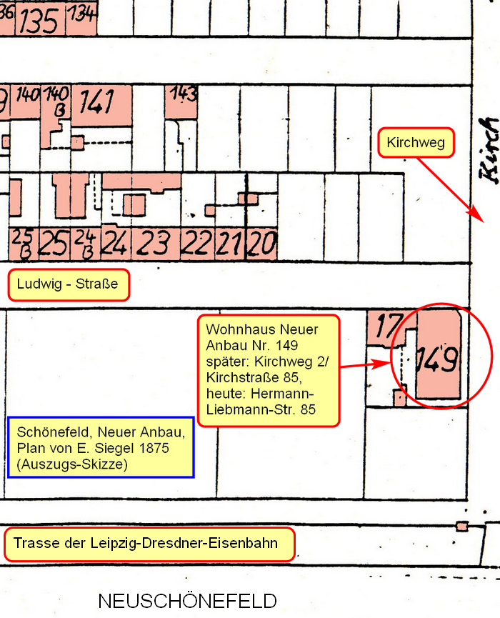 Die Parzellierung des ehemaligen Schönefelder Flurstücks 181 g in einen kleineren Teil 296 fand im November 1871 statt. Davon wurden dann am Kirchweg im Neuen Anbau von Schönefeld (später Leipzig-Neustadt) nochmals die Parzellen 296 a und b abgetrennt und aus dem Teil 296 a entstand dann das mittlerweile sehr schön sanierte Gebäude an der Ecke Hermann-Liebmann-/ Ludwigstraße mit der Brandkatasternummer 149 im Osten Leipzigs.