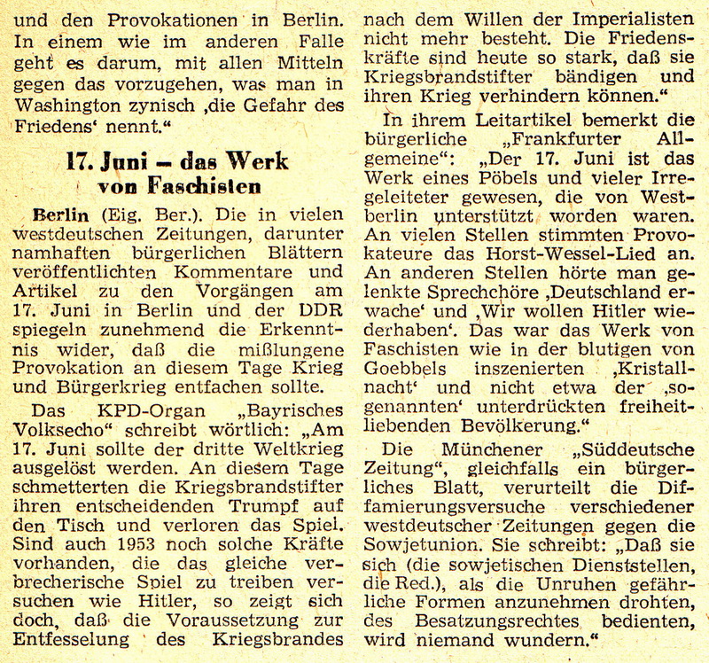 Weil das heute kaum noch jemand glauben kann, habe ich hier als Text-Nachweis zwei Titelseiten-Artikel aus dem ND vom 18. und 24. Juni 1953 ausgewählt. [Quelle #3]