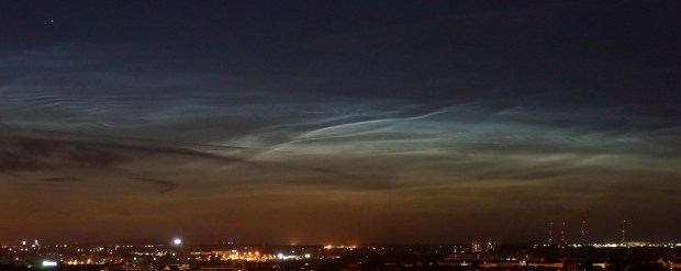 Am 7. Juli 2018, spät abends nach viertel Zwölf, waren am sonst mehr kümmerlichen Leipziger Sternenhimmel beim Blick nach Norden ein paar eigenartige leuchtende Wolkengebilde zu sehen, siehe Bildausschnitt rechts.