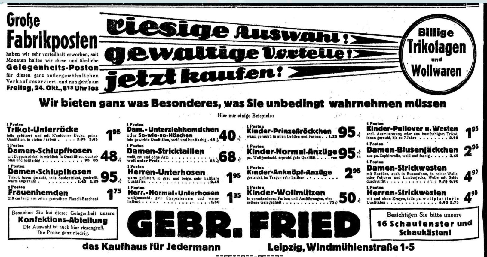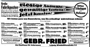 Das Kaufhaus war 1919 vom Schuhhändler Moses Moritz Fried eröffnet worden. Der 1885 in Österreichisch-Polen geborene Fried stammte aus einer jüdischen Kaufmannsfamilie. Die Familie wohnte in der König-Johann-Straße 27 (heute Tschaikowski-Straße). Fried wurde 1942 gemeinsam mit seiner Frau von den Nazis nach Riga deportiert und dort ermordet – auch seine Mutter und seine Schwester starben in Vernichtungslagern.
