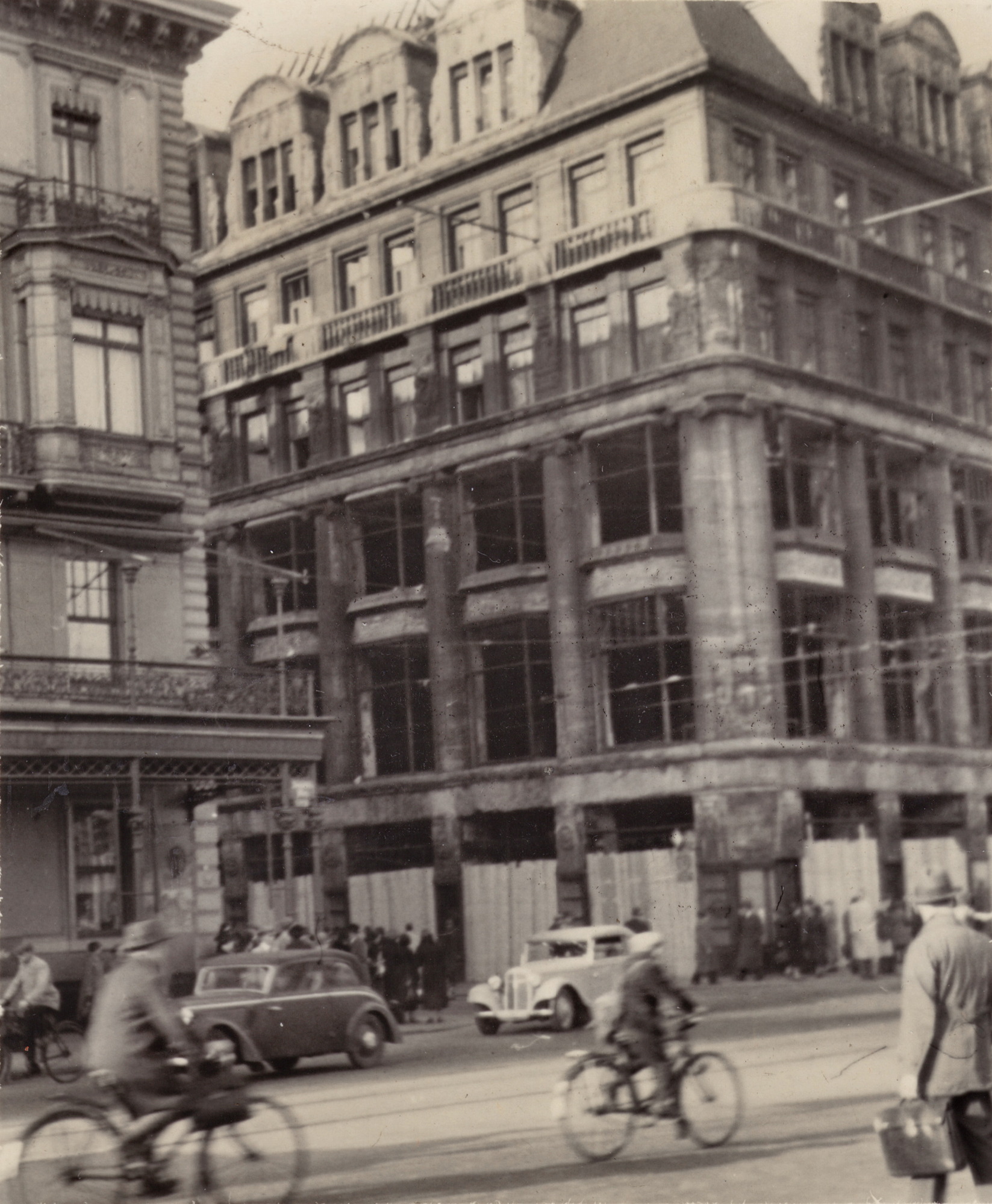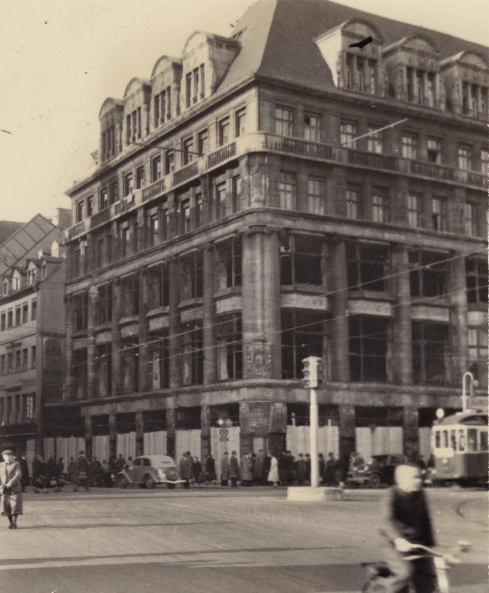 Auf dem Bild das teilweise ausgebrannte Warenhaus mit Blick in Richtung Süden. Die nach rechts abzweigende Seitenstraße ist die Nonnenmühlgasse. Auf der rechten Straßenseite schließt sich seit 2015 das Gebäude der katholischen Propsteikirche St. Trinitatis an.