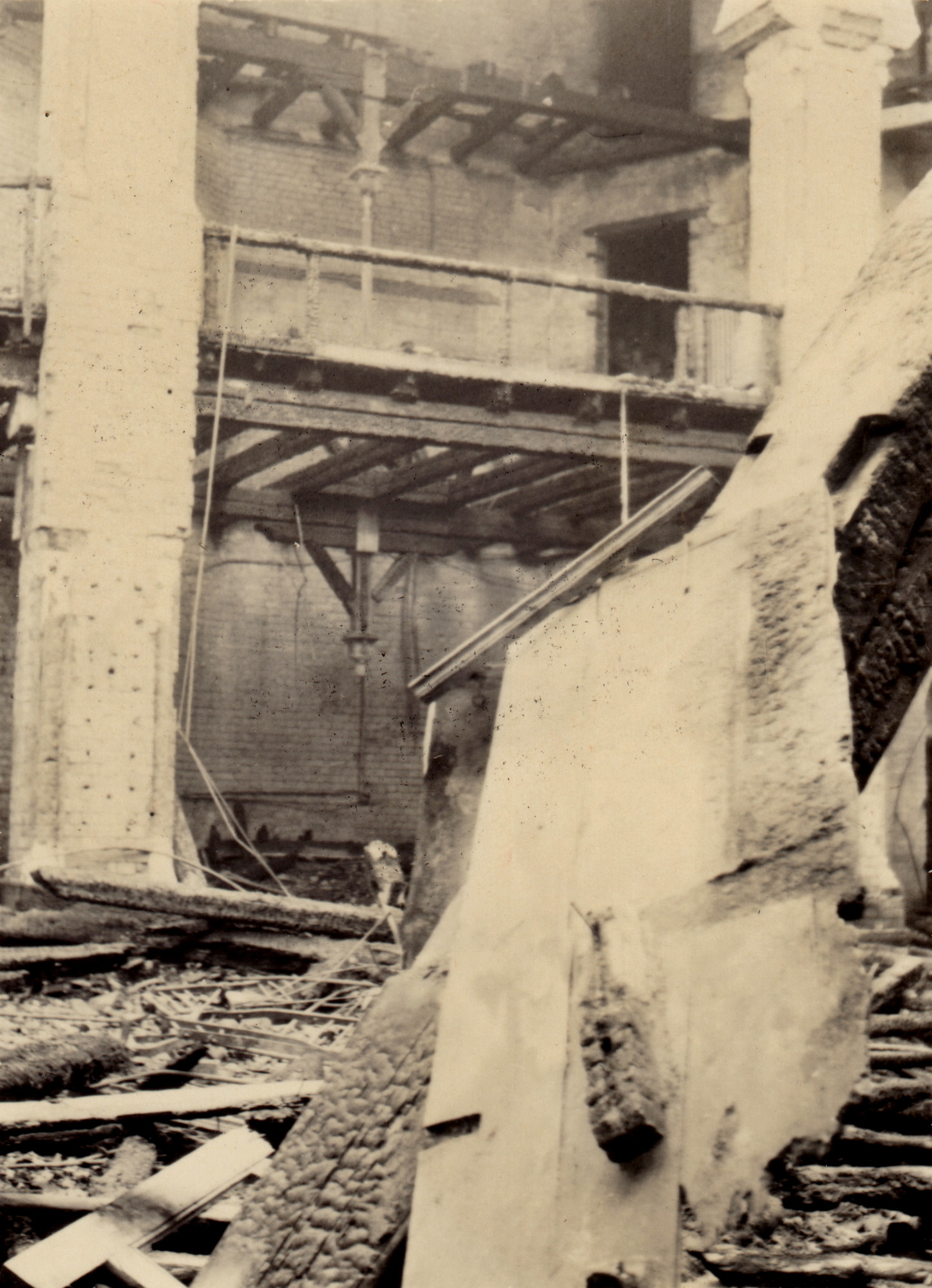 Das Foto rechts zeigt das teilweise ausgebrannte Kaufhaus Gebr. Fried.