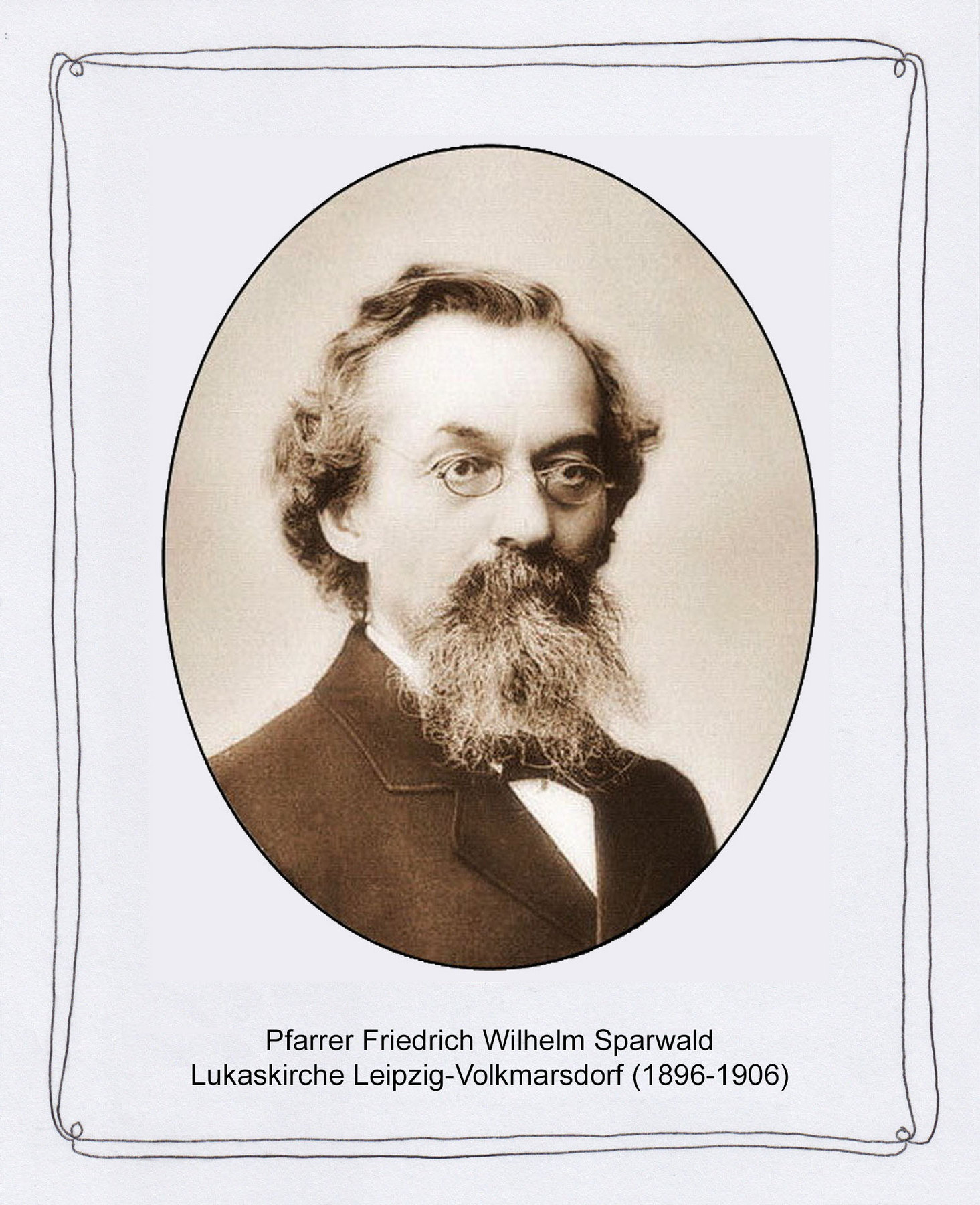 Das läßt sich auch im Sächsischen Pfarrerbuch aus dem Jahr 1939 nachschlagen, dort ist Pfarrer Sparwald, mit vollem Namen Friedrich Wilhelm Sparwald, als zweiter Pfarrer der Lukaskirche von Leipzig-Volkmarsdorf in der Zeit von 1896 bis 1906 vermerkt. [Quelle #5]