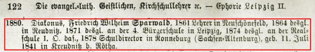 in den Folgejahren machte Friedrich Wilhelm Sparwald als Lehrer Karriere – begonnen als 20jähriger in der Dorfschule über die mittleren und höheren Stadtschulen Leipzigs bis zum Schuldirektor in Ronneburg im Alter von 37 Jahren. Er konnte anscheinend gut mit Kindern, Jugendlichen und Erwachsenen umgehen.