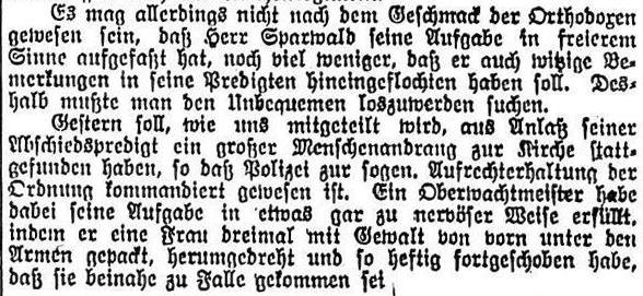 Pfarrer Sparwald … pflegte in seine Sonntagspredigten die alltäglichsten Dinge und ein gelegentliches Scherzwort einzuflechten.