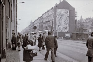 • 7   und TS (das Titelbild) vom Bildband zeigt einen Straßenabschnitt der Ernst-Thälmann-Straße an der Ecke Hildegardstraße, rechts das Zoo-Eck Nordost im Eckgebäude Ernst-Thälmann-Straße 87, links die HO Flax und Krümel (Kinderbekleidung) im Eckgebäude Ernst-Thälmann-Straße 85